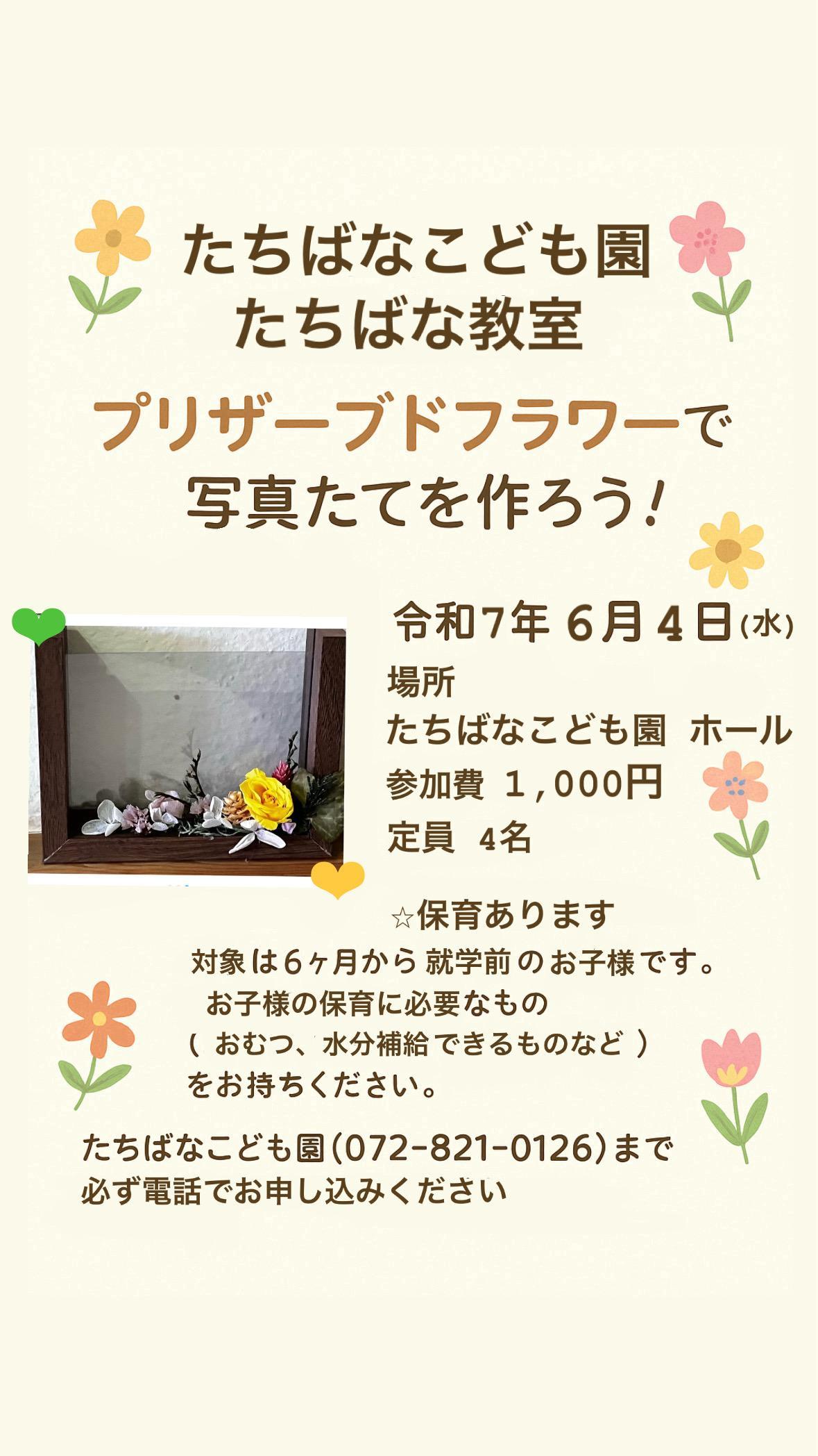 6月のたちばな教室は、ママ(パパももちろんOK!)のリフレッシュ講座「プリザーブドフラワーで写真たてを作ろう!」です。お花の先生と一緒にかわいい写真たてを作ってみませんか?
