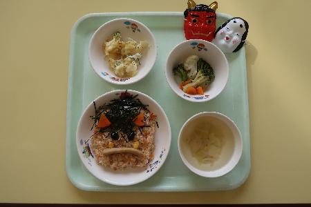 給食はとっても可愛い鬼の顔のチキンライスで、子どもたちも「鬼の顔や~!」と大喜びで食べていました。
