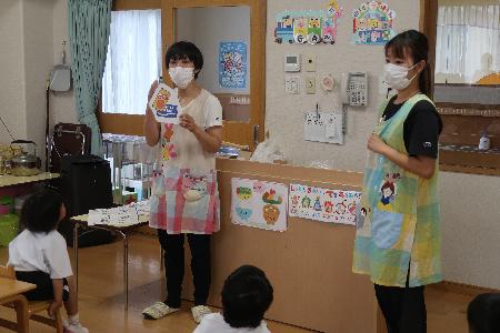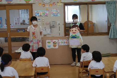 園では4日に、りす・ぱんだ・ぞう組の子どもたちに向けて、エプロンシアターや、クイズ形式にして歯の大切さを伝えたり、歯ブラシに見立てたものを使って歯磨き指導をしました。話を聞いた子どもの中には、「歯って大事やなー」とつぶやいている子もいましたよ。