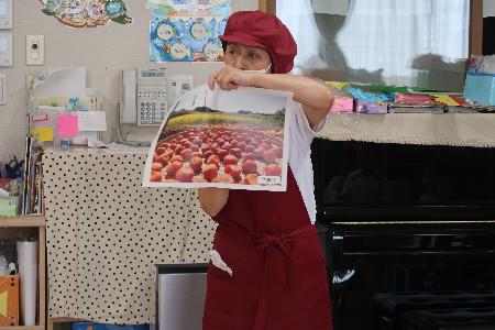 園では、ぞう組の子どもたちに、給食の先生が梅の実がどういう工程で梅干しになるか、写真を見せて説明してくれたり、体にいい成分が入っているかということを、クイズ形式にして楽しく教えてくれました。
