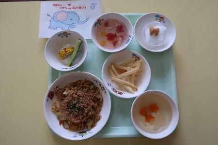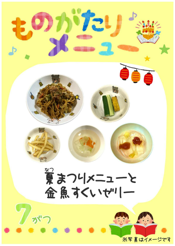 7月は「パオちゃんのなつまつり」の絵本を題材にしたものがたりメニューでした。