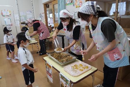 りす・ぱんだ・ぞう組は、子どもたちが色塗りをした動物のお面をかぶり、屋台風にして並べた給食を取りに行くというスタイルで、夏まつりを楽しみました。