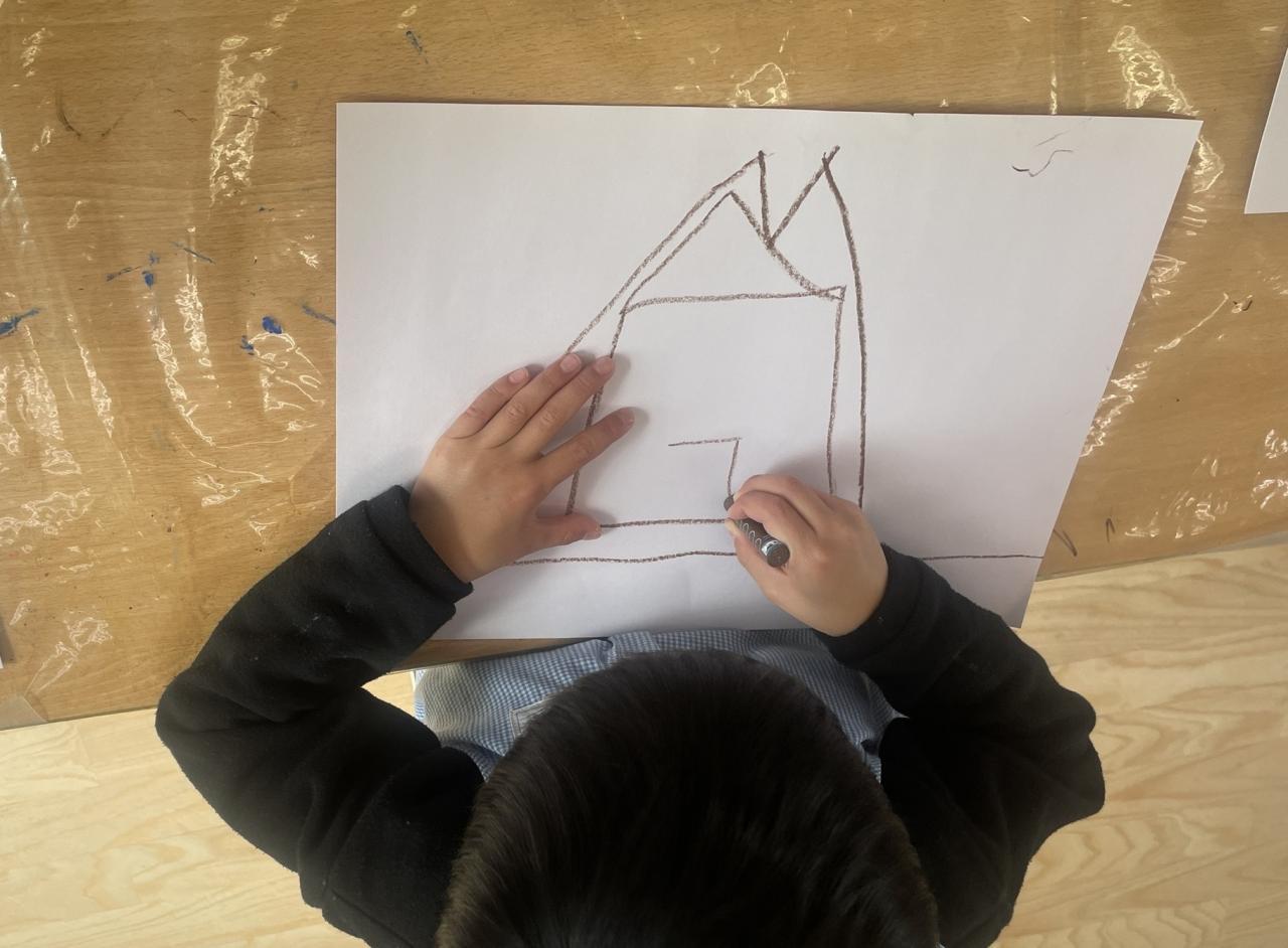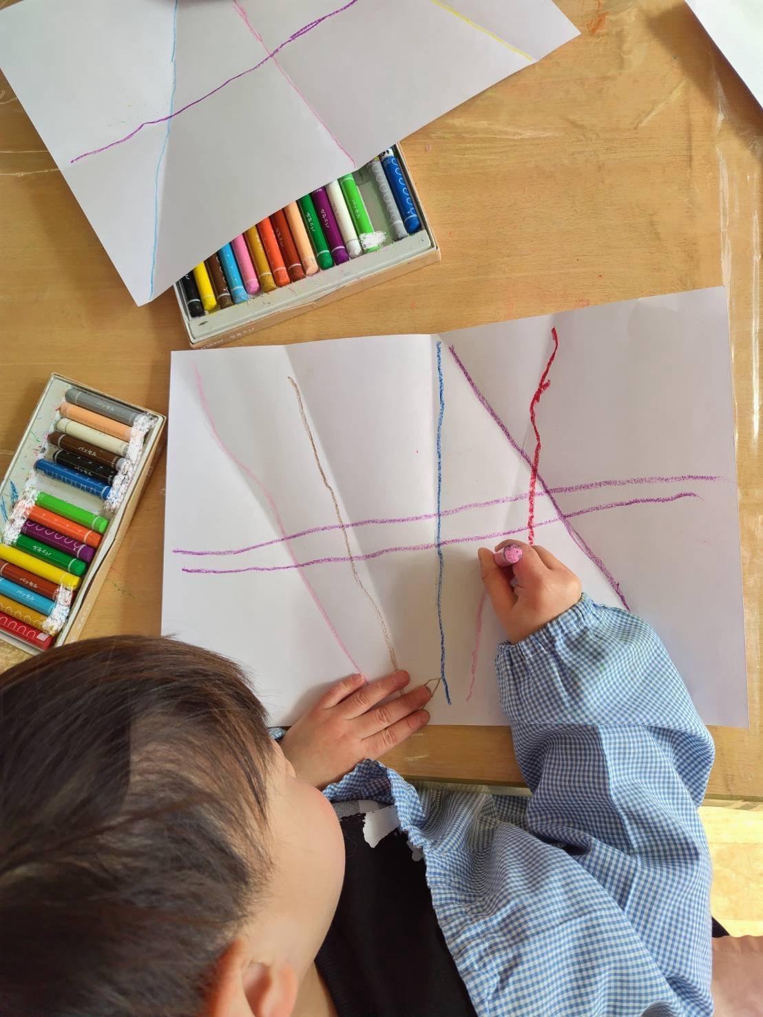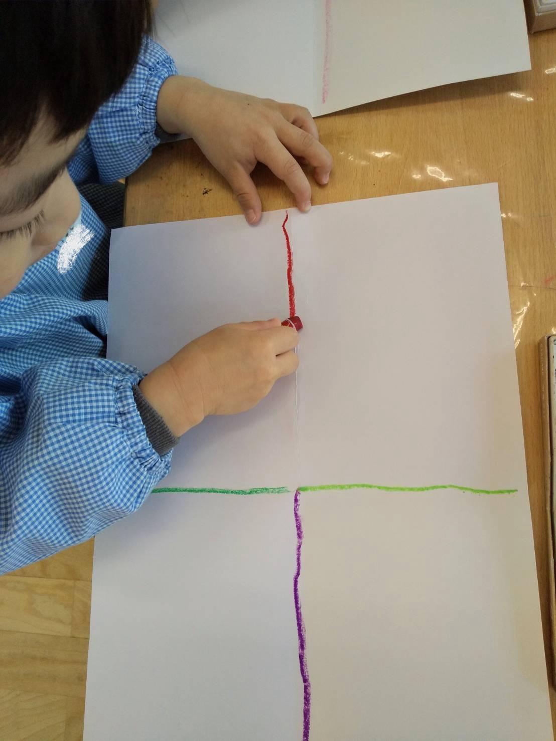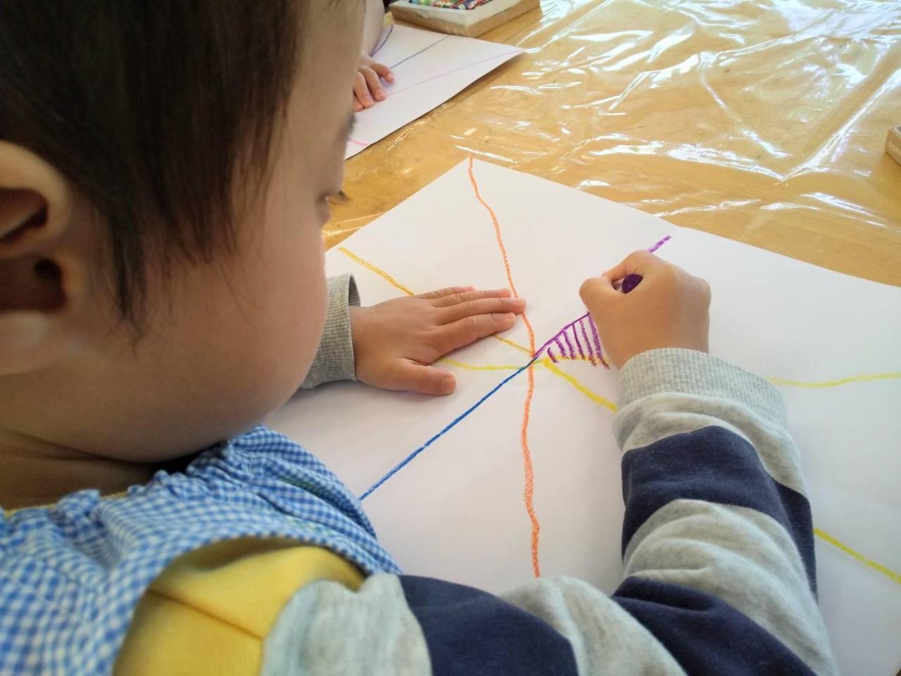 たけ組は、画用紙に十字やバツに線を描き入れて、