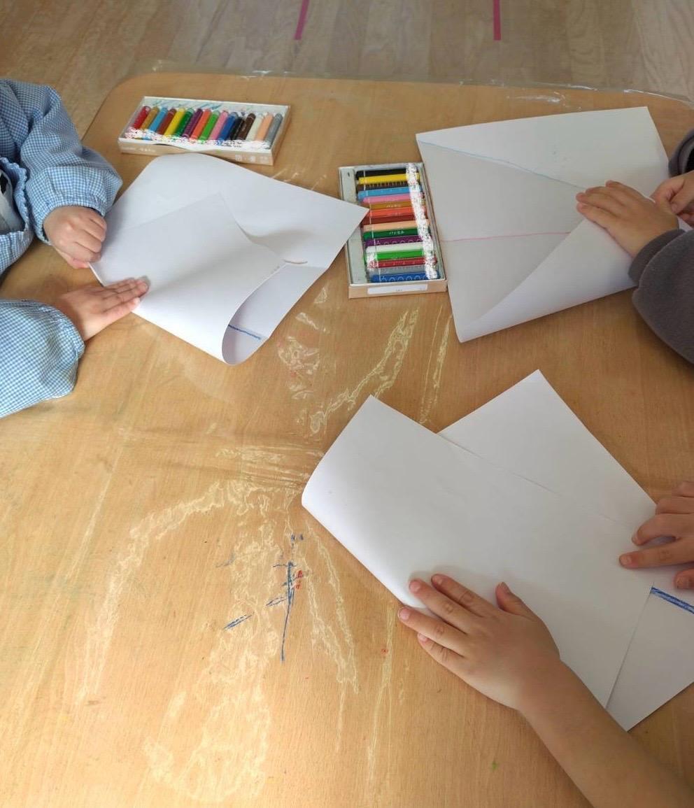 うめ組は、画用紙に折り目をつけてその線をなぞり、
