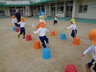 バケツの周りを後ろ向きになりながら回るなど、考えながら身体を動かす取り組みをしました。