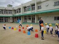 始めに、カラーバケツを使い、タッチをしながら走ったり、