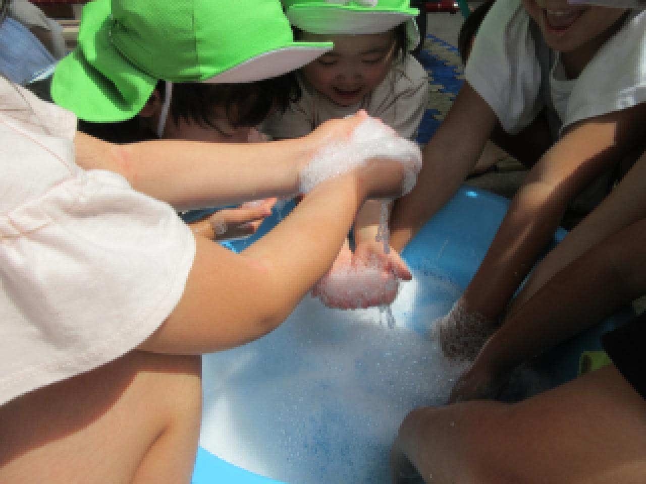 もこもこの泡が出来、泡をすくったり、コップに入れジュースや