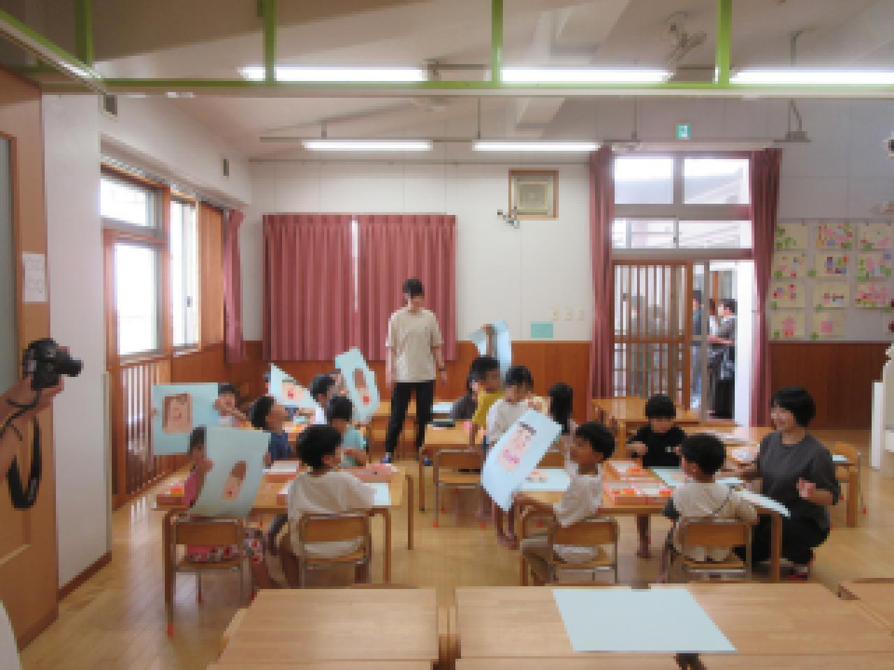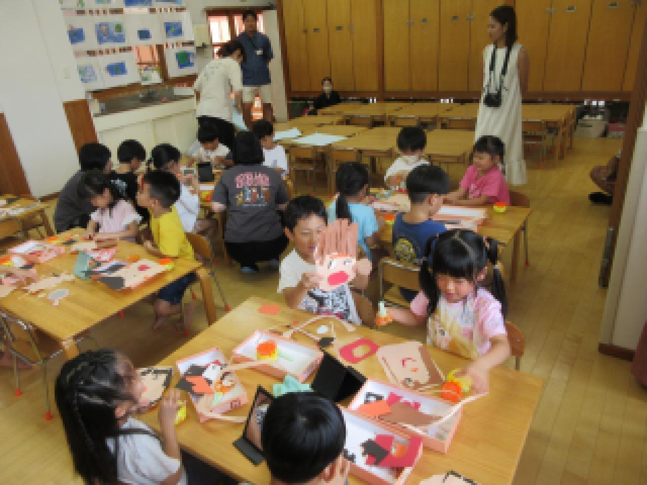 4歳クラスは、2階ホールで製作(運動会の旗)を作りました。