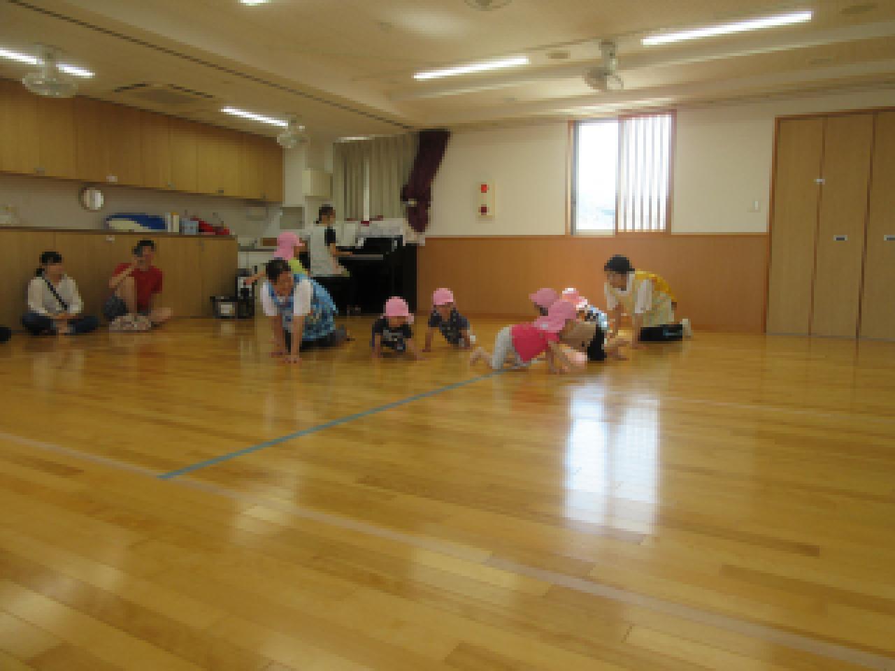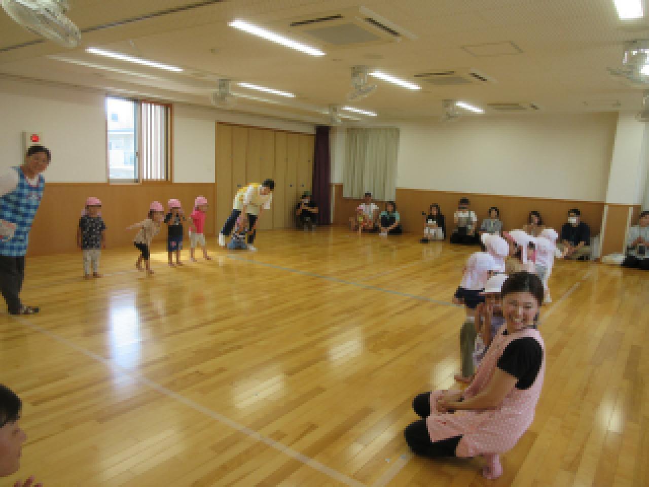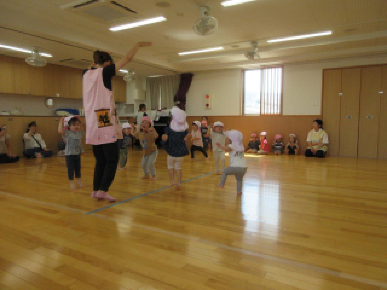 保育参観2日目の2歳クラスは、3階ホールで朝の会・リトミック・パラバルーン