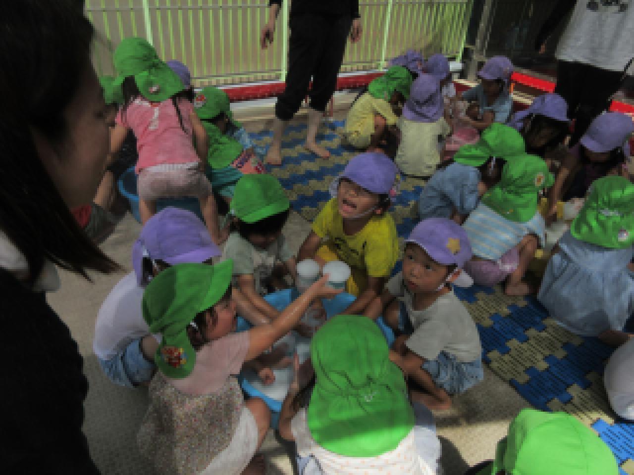 笑顔のこどもたち。溶けた氷水の中に石鹸を入れ混ぜると、