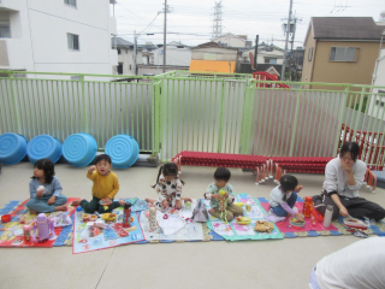 テラスで待ちに待ったお弁当!!満面の笑みで、お弁当の包みを開け