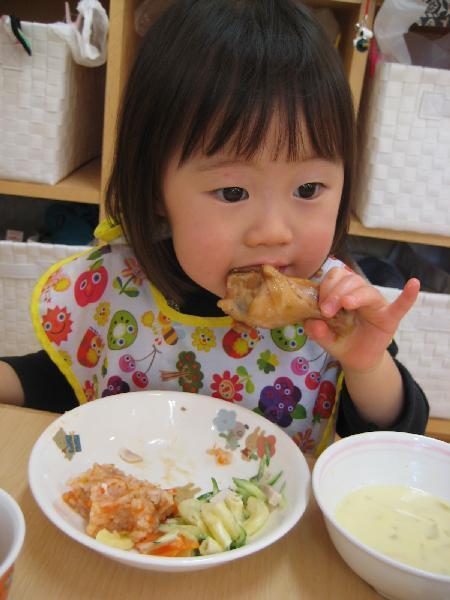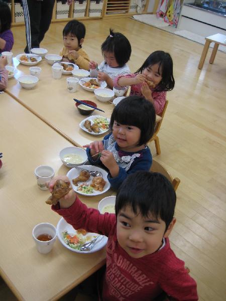 今年のクリスマス会は「サンタさん来なかってん~」と残念そうに、給食の時間に教えてくれた、こどもたち。。3時のおやつの時間にサプライズで遅れてサンタさんが登場しました(^_-)-☆各クラス反応が違い、ひよこ組は本物のサンタさんに驚き泣いてしまう子もいました。りす組のお友達は、警戒しながらプレゼントをしっかり受け取る姿★笑 うさぎ組のお友達は、クリスマスの行事に慣れてきているので、「サンタさん来てくれたー」と大喜び♪給食は、チキンにかぶりつき、サンタのケーキを食べおなかいっぱい楽しい1日となりました。
