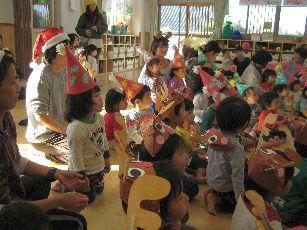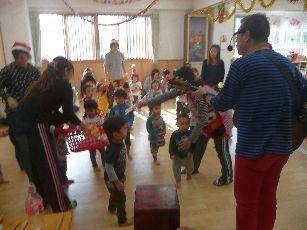 今日はクリスマスの集いです。八尾たんぽぽ保育園にもサンタさんがやってきてお友達にプレゼントを持ってきてくれました。子どもたちからは「何に乗ってきたの?」「どこからきたの?」等の質問がでていましたよ。そのあと各クラスプレゼントのあとは各クラスでサンタさんの記念撮影をしたのですが、見慣れないサンタさんが怖くて泣く子がいる反面、サンタさんの白い髭をさわるお友達もいました。