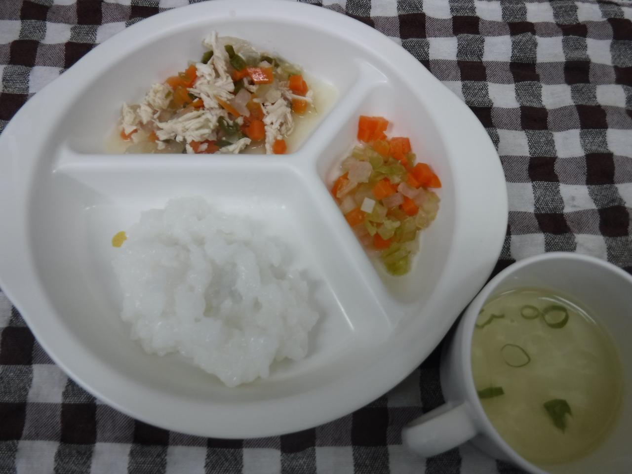 離乳中期昼食:全粥 鶏肉と野菜の煮物 キャベツの根菜サラダ 玉ねぎのスープ