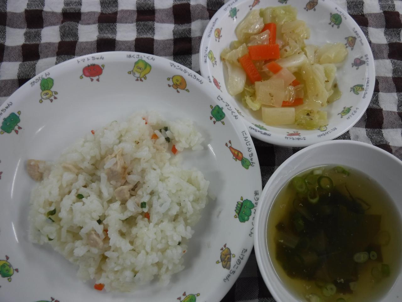 普通給食2歳児量:チキンピラフ 胡麻ドレッシングサラダ 玉ねぎとわかめのスープ