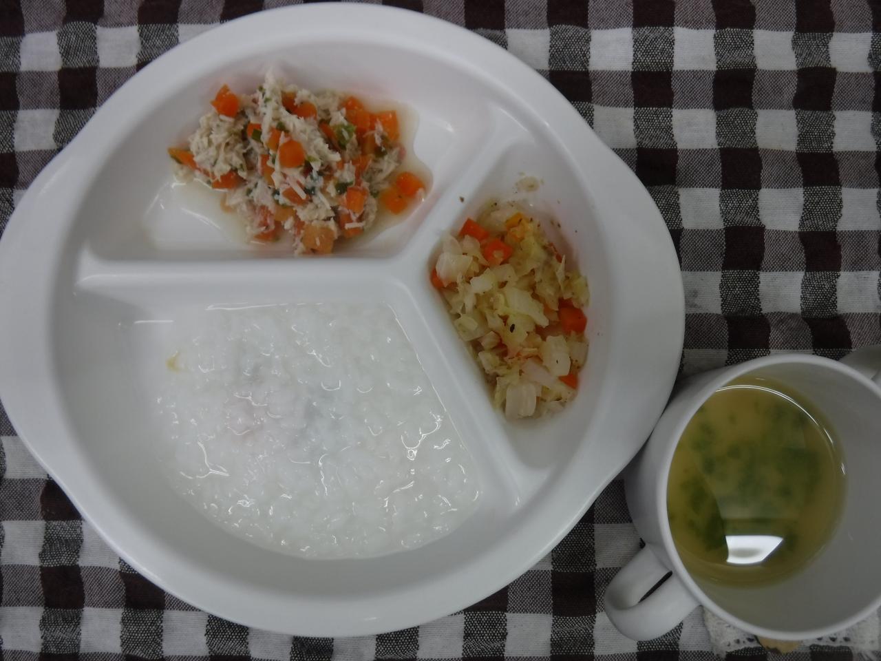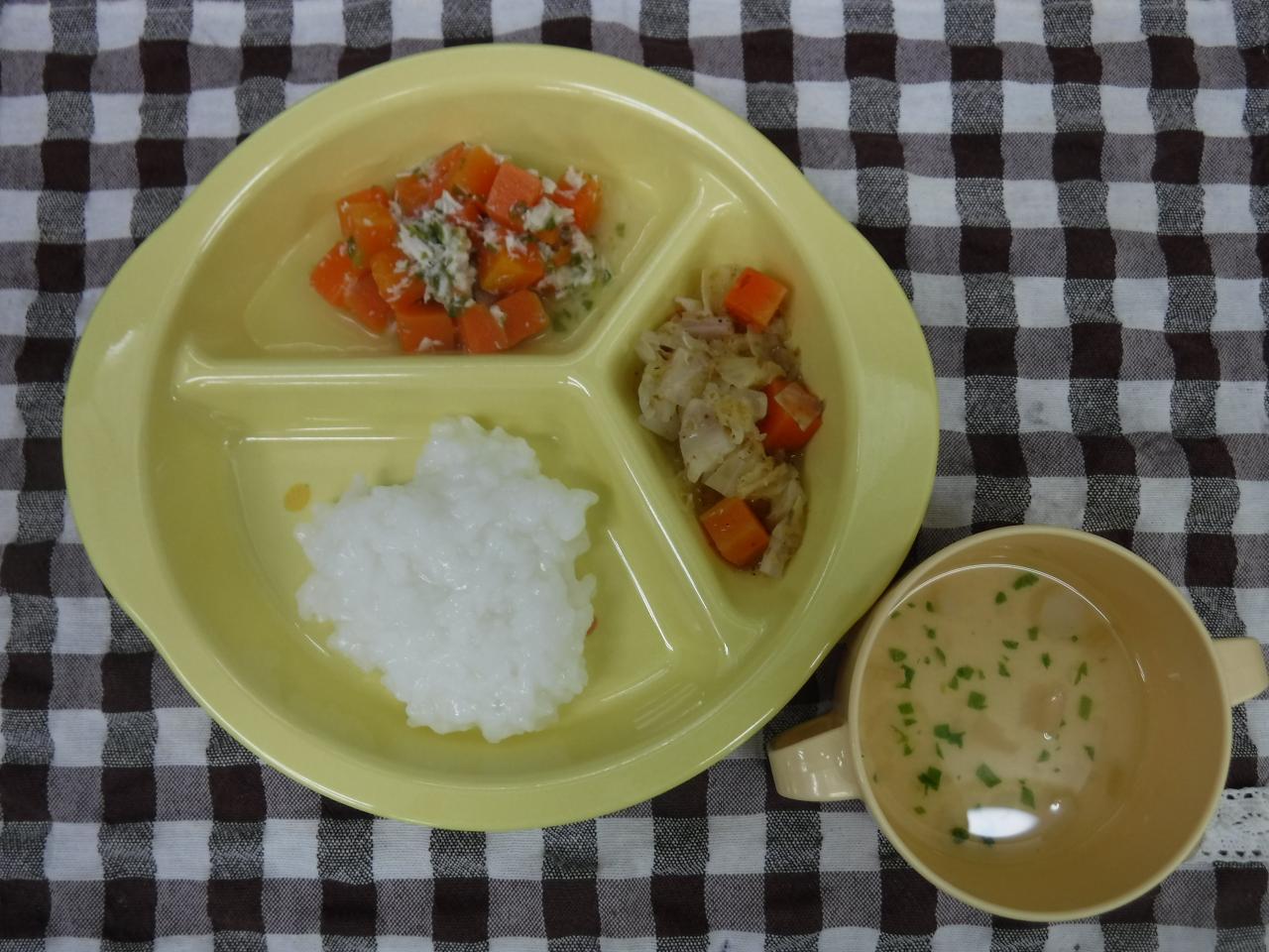 離乳食:中期 全粥 鶏肉の塩麴煮 キャベツのおかか和え 麩の味噌汁