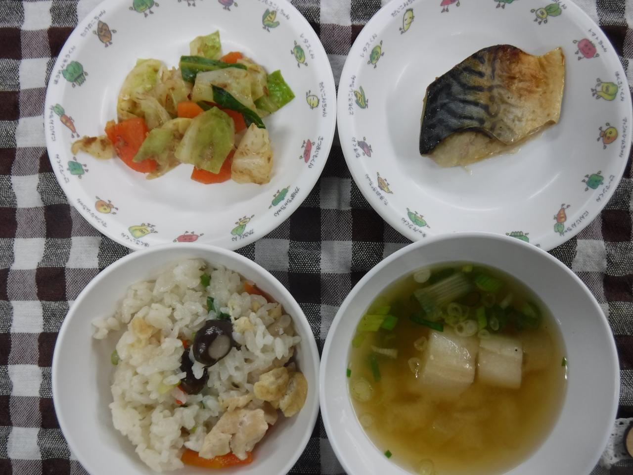 給食:きのこご飯 魚の塩麴焼き キャベツのおかか和え 麩の味噌汁