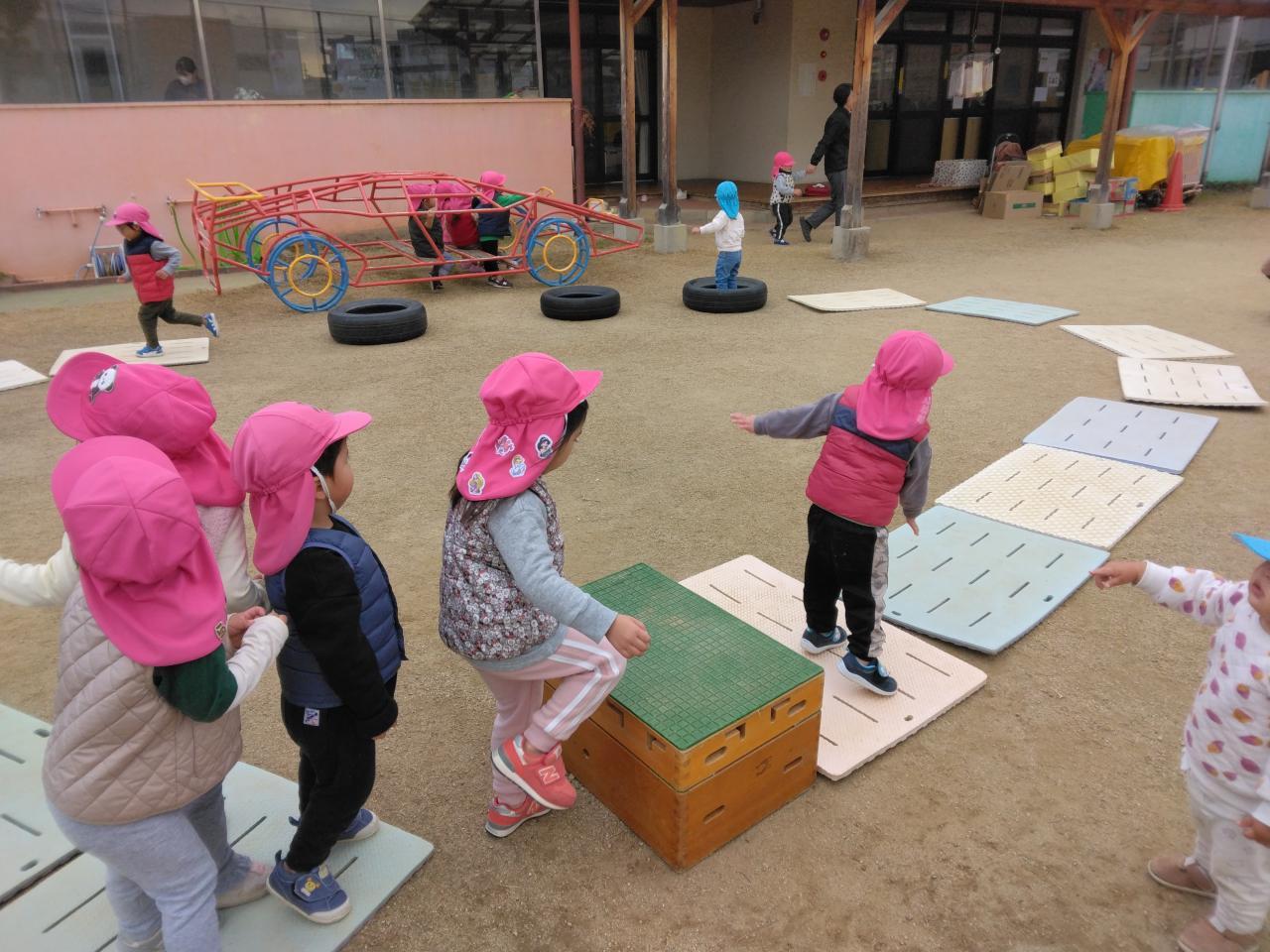 巧技台から両足ジャンプで飛びおりられるようになってからだを使って楽しく遊んでいます。「お友だちが終わってからスタート!」と順番待ちも上手にしていました。