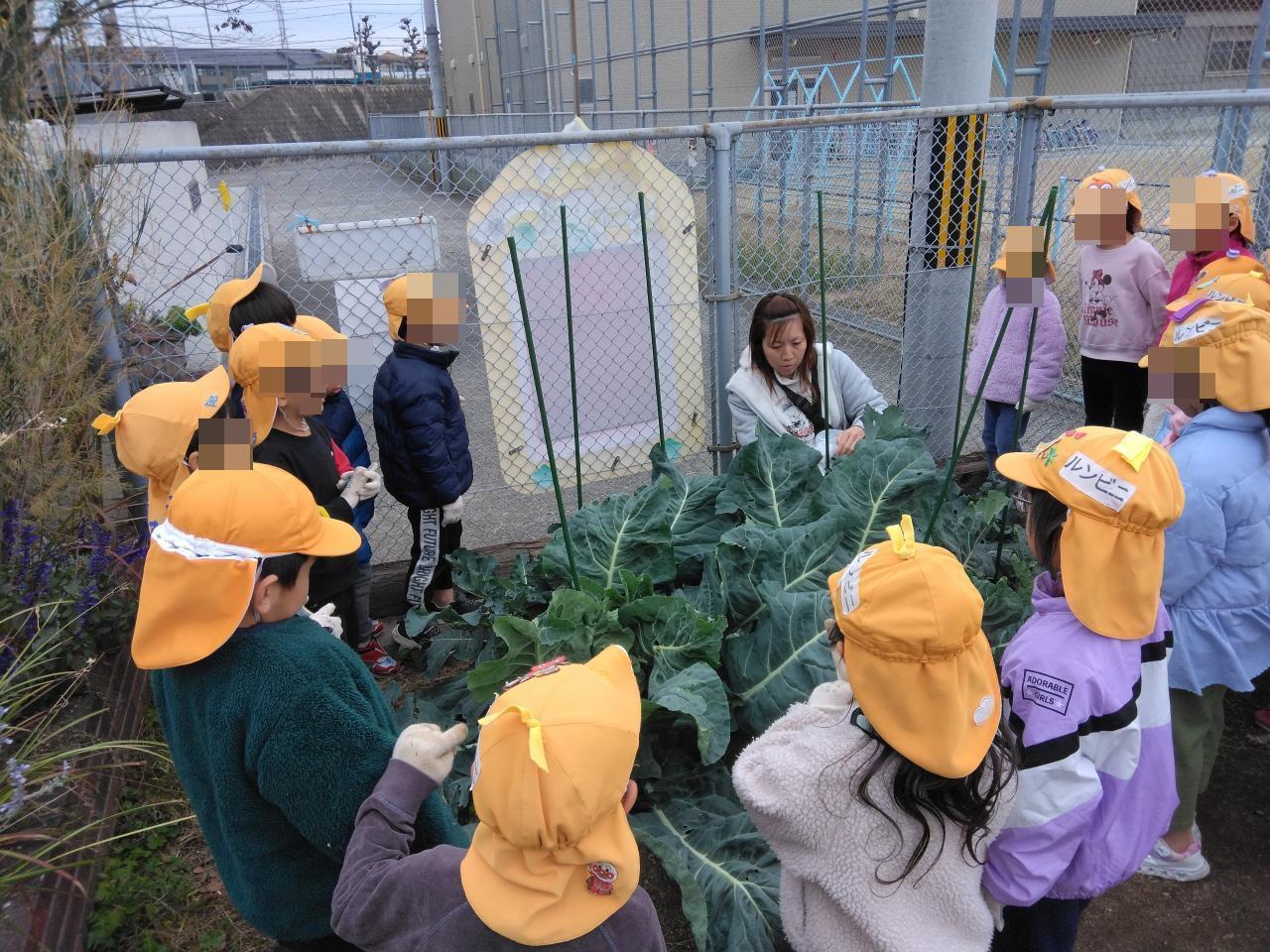 大きな株一つと小さな株を一つ収穫して、それぞれの重さや匂いはどう?と順番に回して見ました。「なんか、クサイ」「臭くないで、ブロッコリーのニオイやで」「いい匂い」と話していました。野菜が苦手な子もいて感じ方は様々ですが、子どもたちの表情はどの子もうれしそうでした。後日、給食で食べられると聞いて、楽しみにしています。