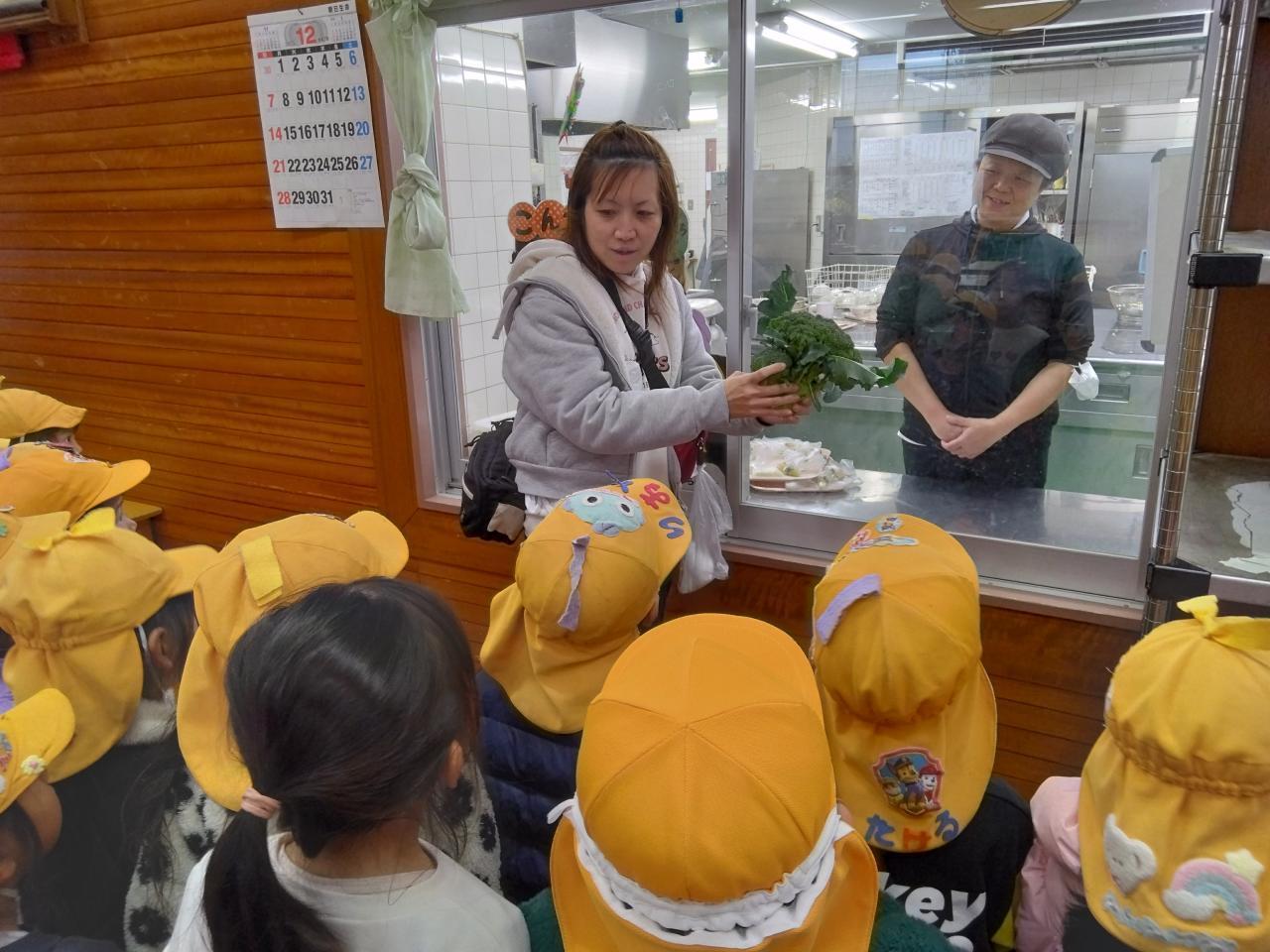 畑のブロッコリー、給食に使ってね!厨房まで届けました。(感染症予防のため、ガラス越しにお願いして、調理終了後に渡しました)