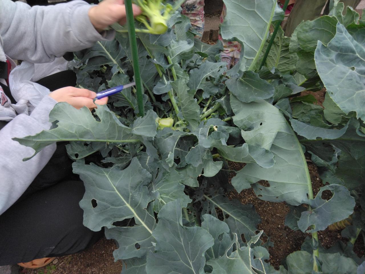 すいか組のこどもたちが、畑のブロッコリーを収穫しました。