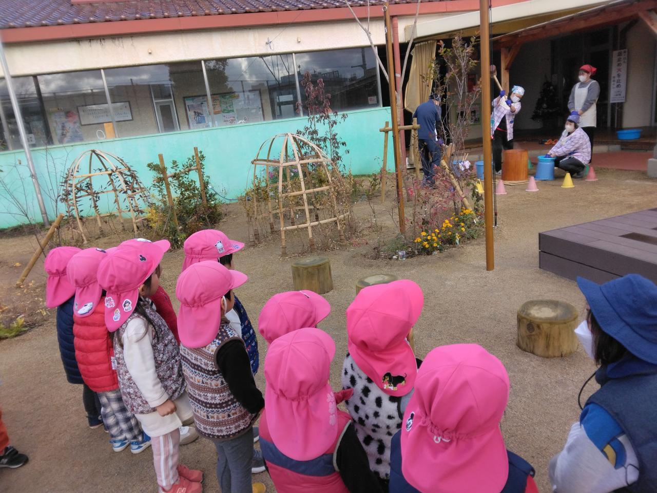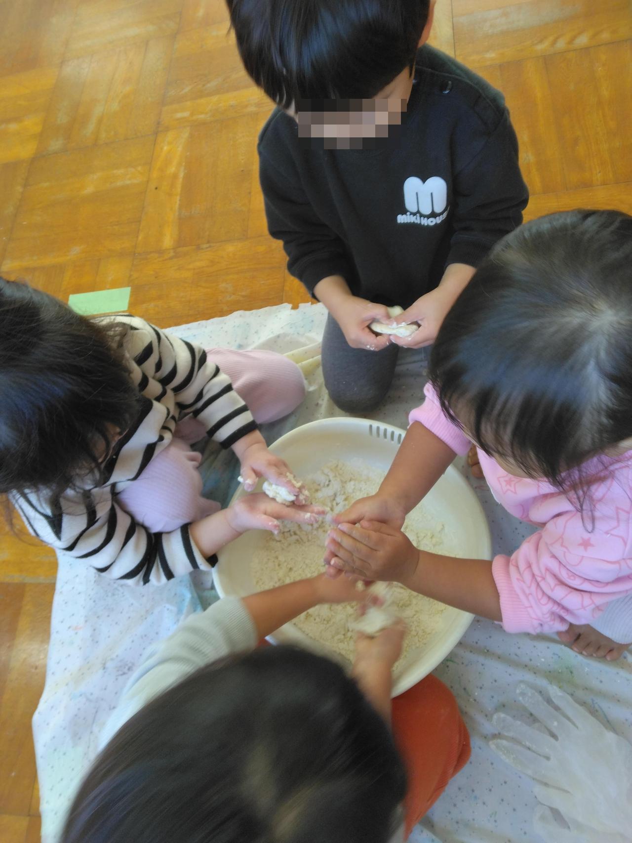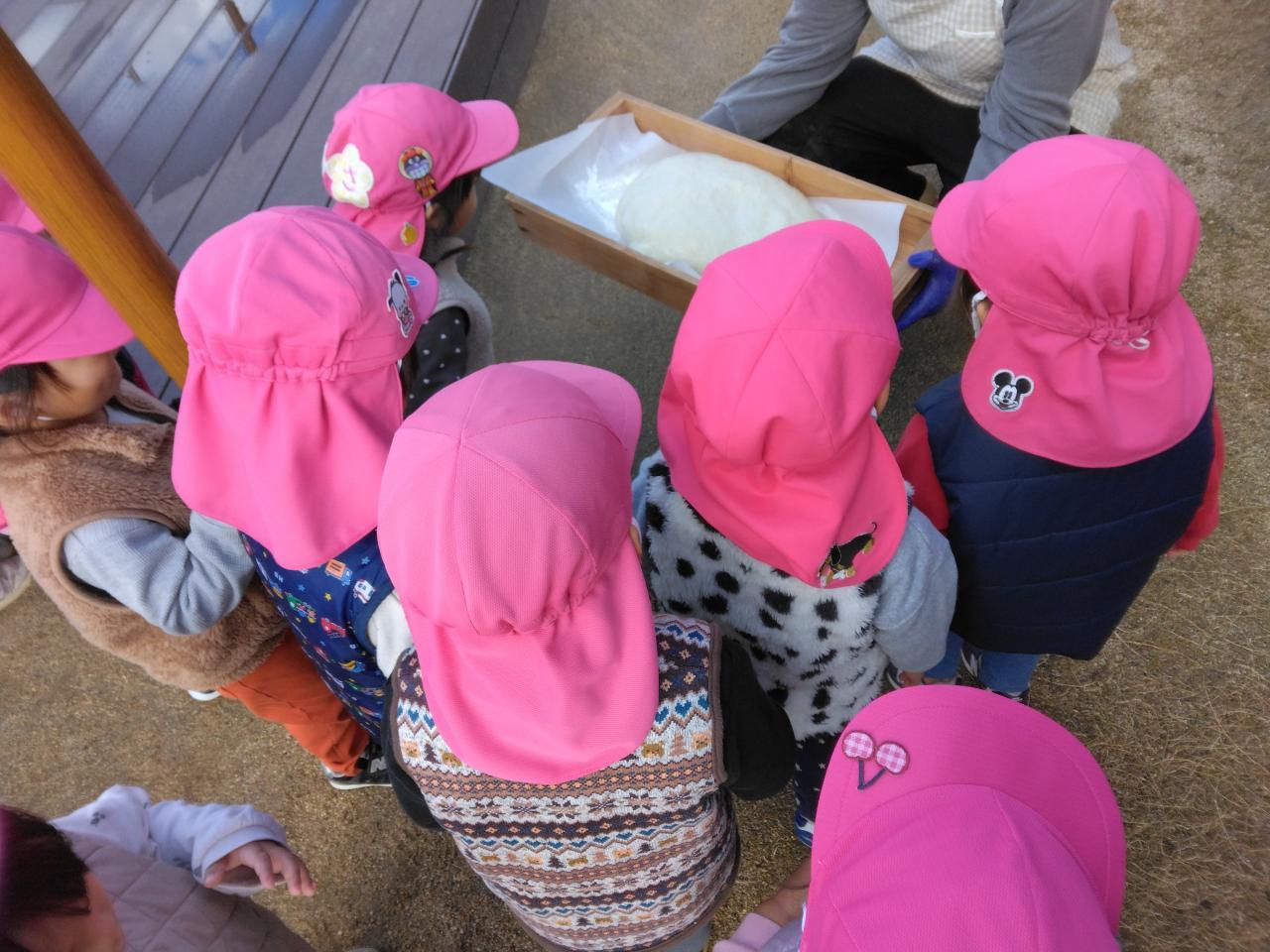 園庭遊びに出ようと、靴を履いて準備をしていると、ぺったんぺったんと聞こえて来たので「おもちつき、はじまったよ!見たいね!」わくわくしながら、みんなで見に行きました。