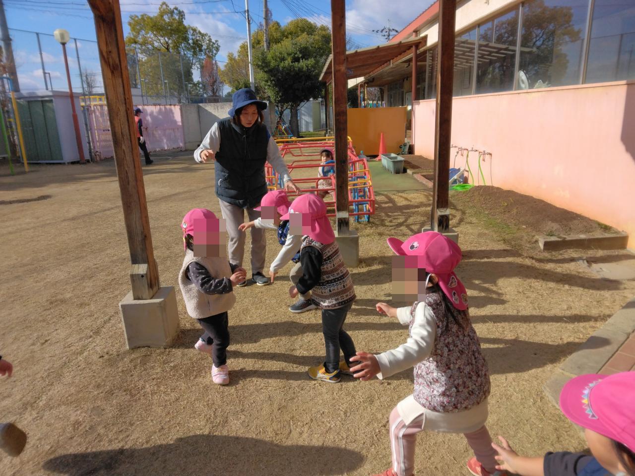 その後は、おおかみごっこをしました。軒下を、お家にして、「トントントン」「だれですか?」とおかあさんかな?何の音かな?とドキドキわくわく、怖がることも演じながら、お友達と逃げ回り、まだまだおおかみごっこが楽しいみんなです。