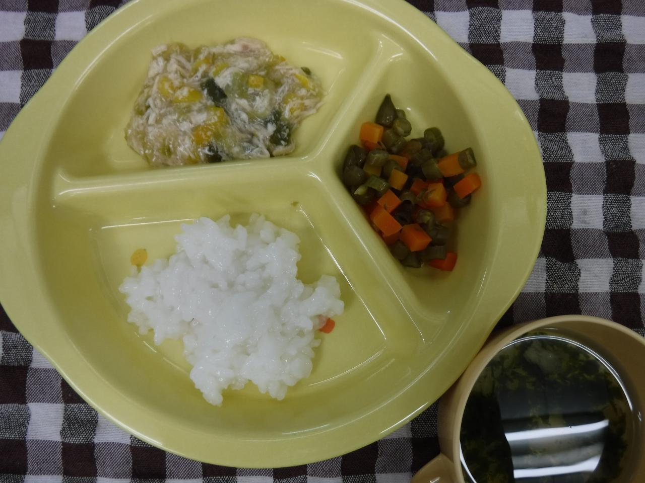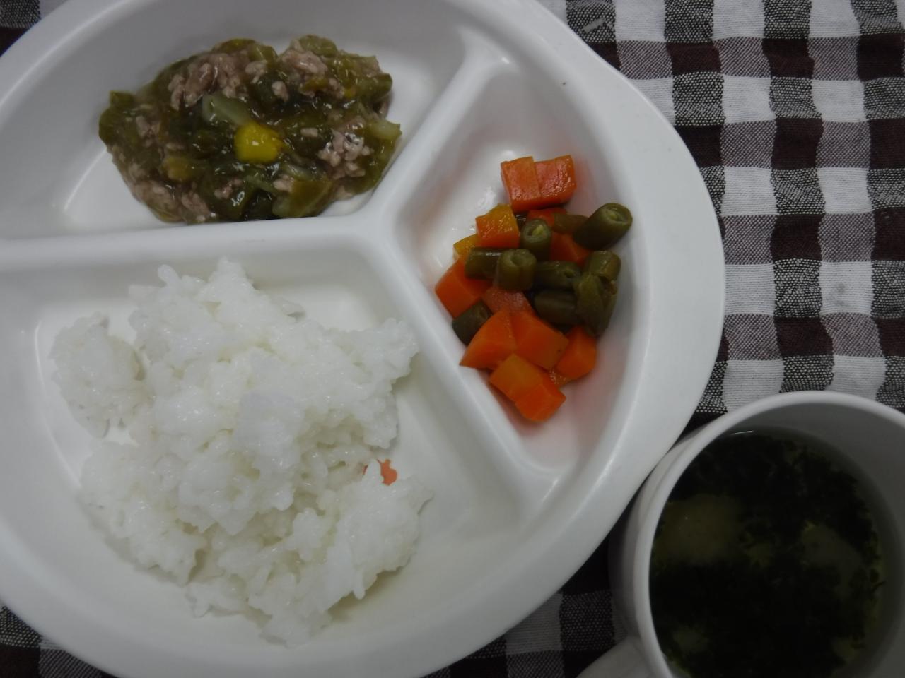 中期:全粥 鶏肉の回鍋肉 インゲンサラダ 麩のお澄まし