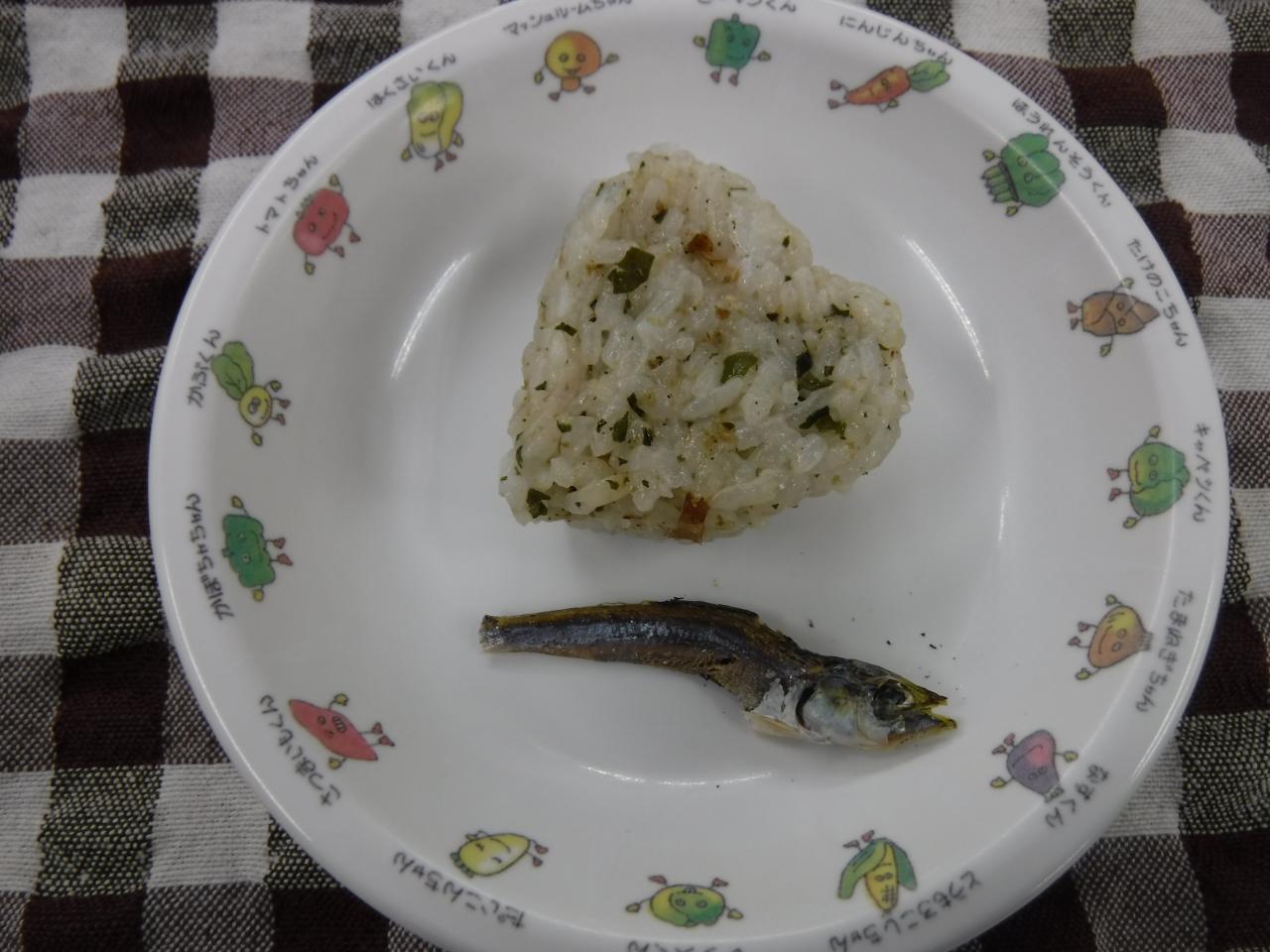 普通おやつ2歳児量:わかめおかかおにぎり 咀嚼:炒り煮干し