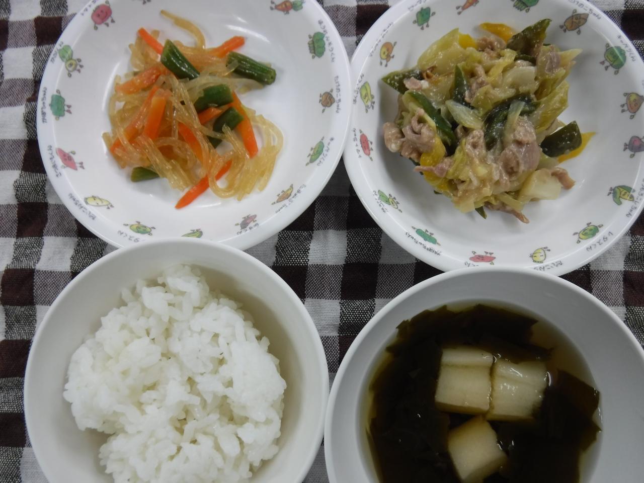 普通給食2歳児量:ごはん 回鍋肉 中華サラダ 麩のすまし汁