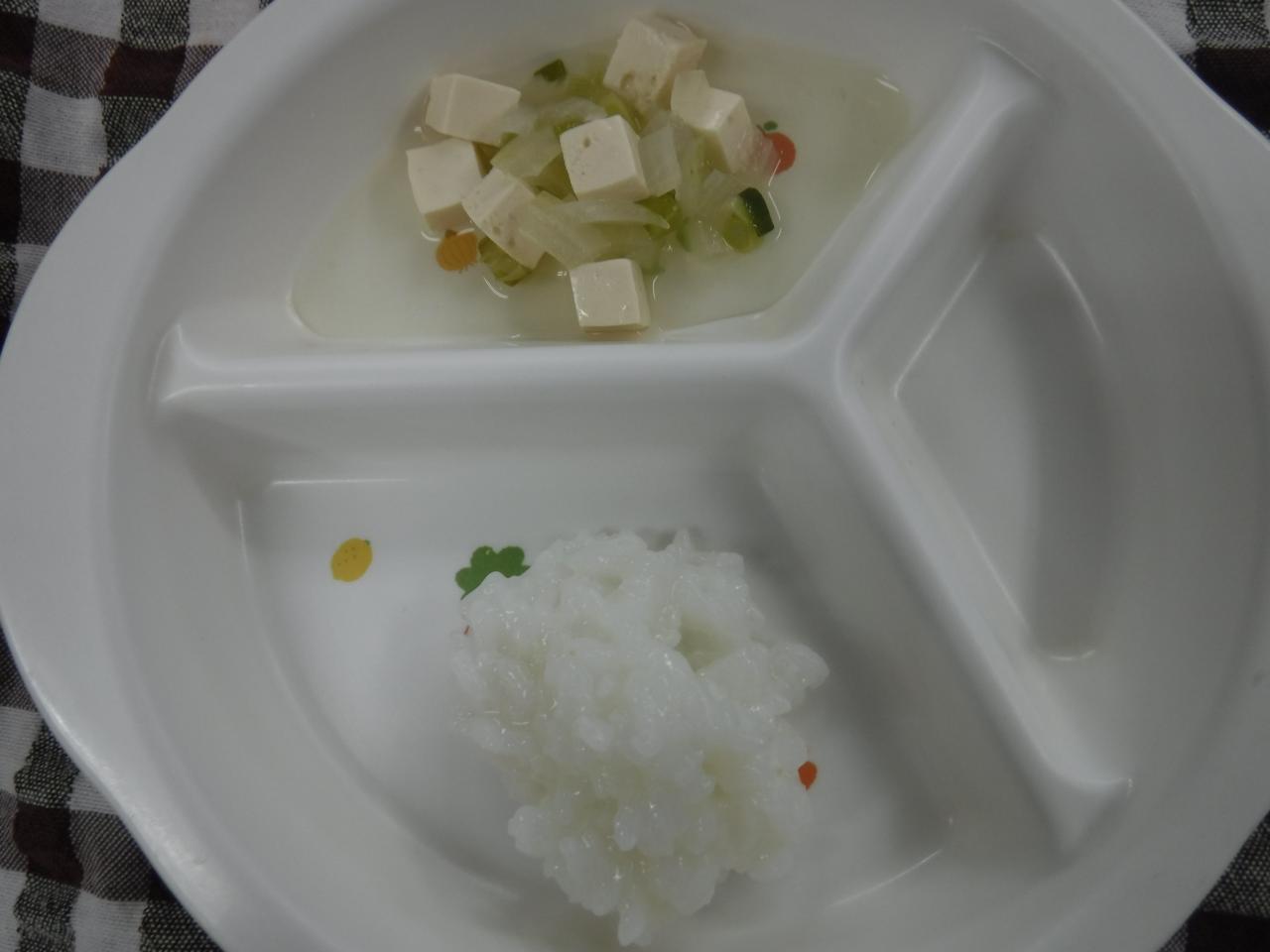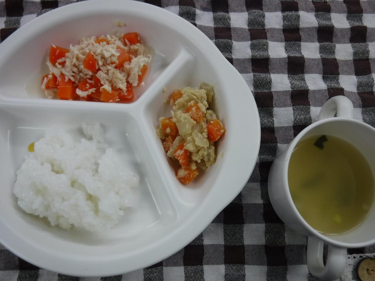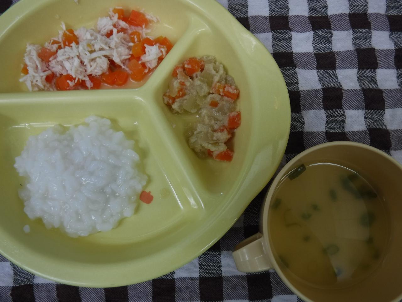 離乳後期昼食:軟飯 鶏肉とコロコロ人参 高野豆腐のフワフワ煮 ねぎネギ味噌汁