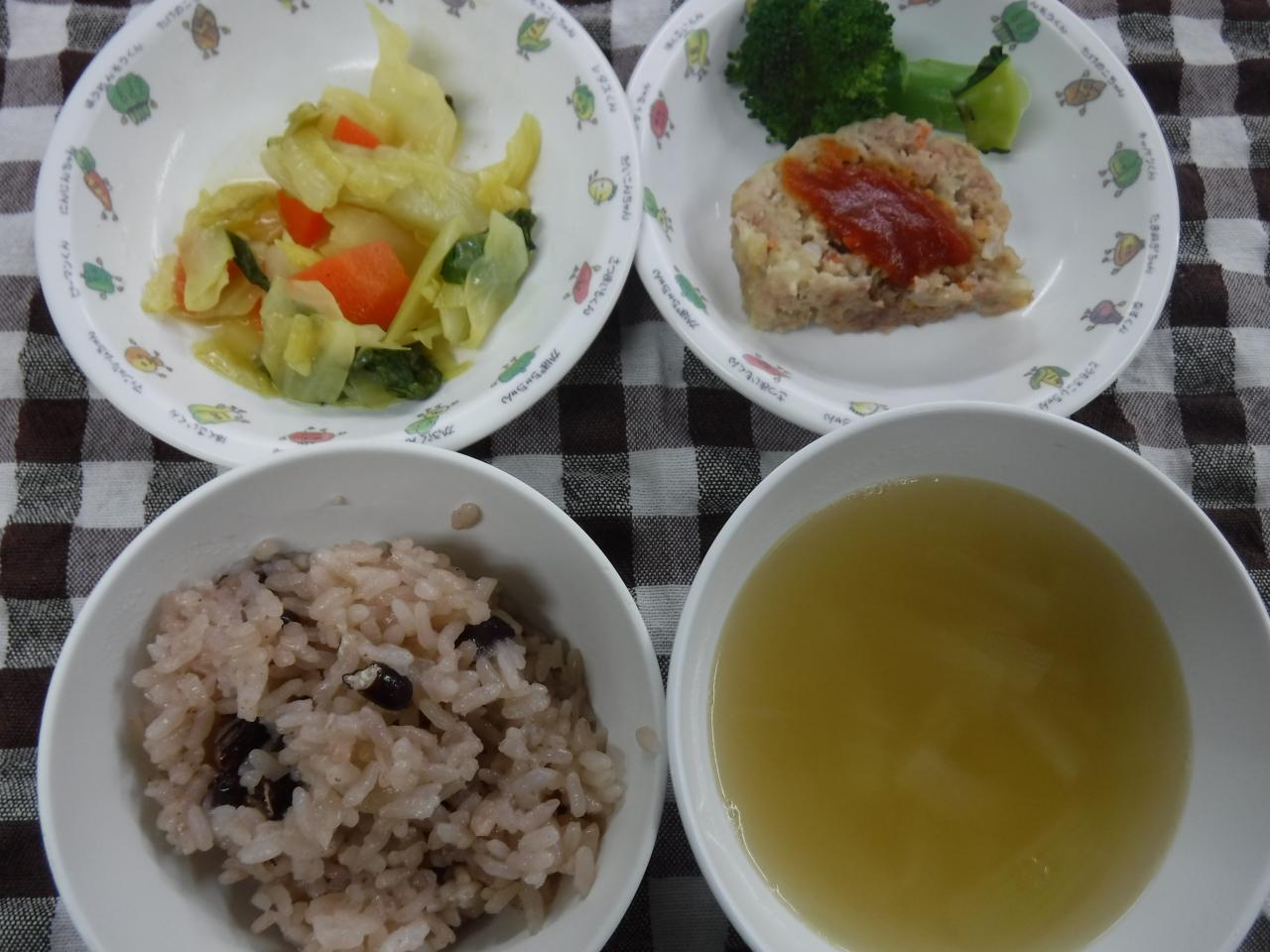 普通給食2歳児量:お赤飯 ヘルシーミートローフ キャベツのカレードレッシングサラダ オニオンスープ