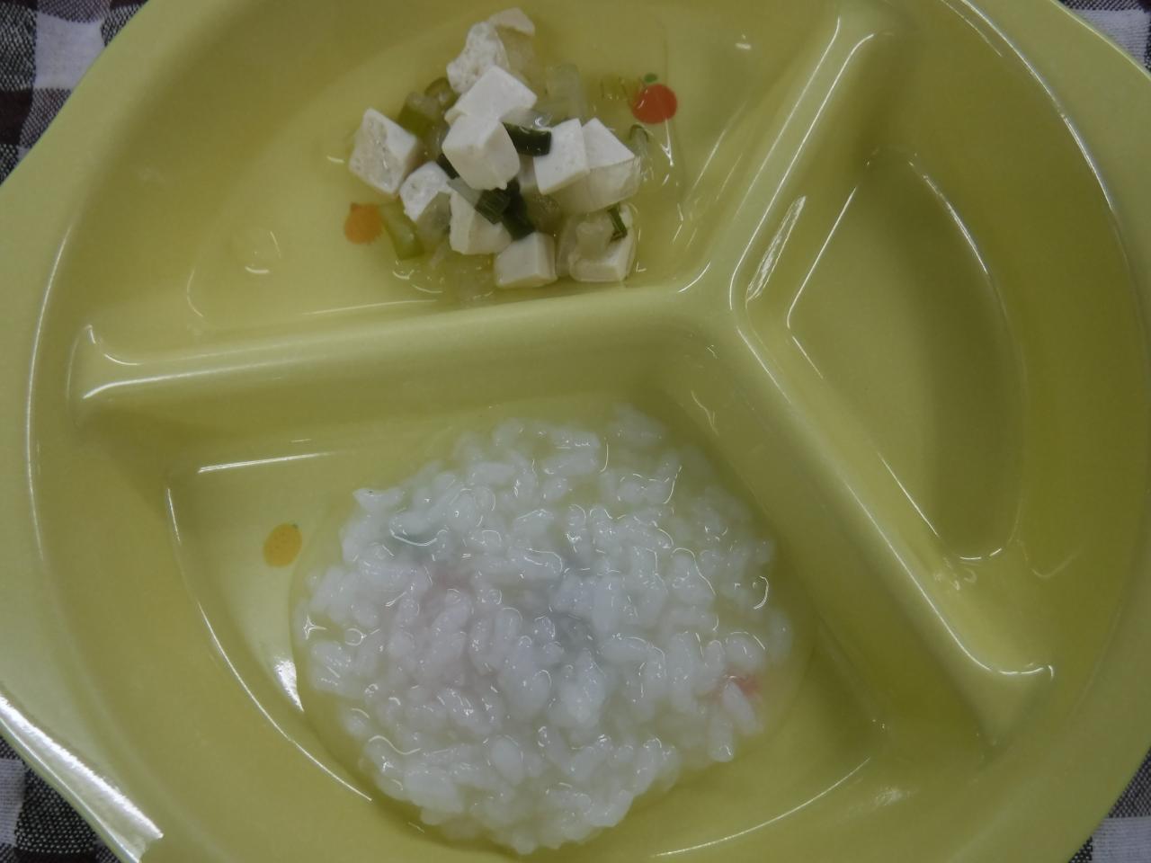 離乳中期昼食:全粥 鶏肉とコロコロ人参 高野豆腐のフワフワ煮 ねぎネギ味噌汁
