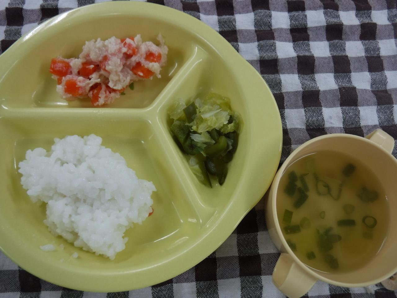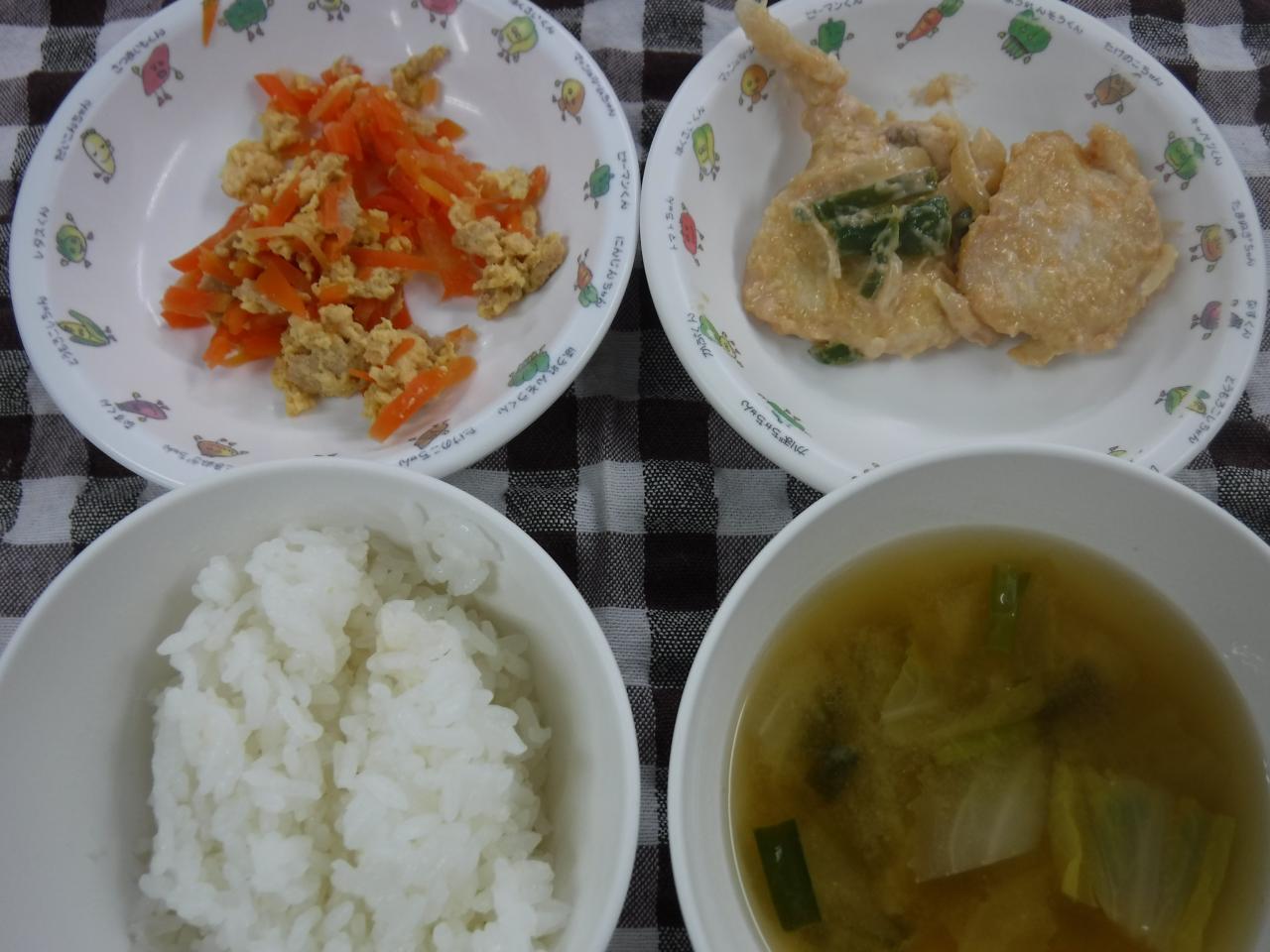 普通給食2歳児量:ごはん 鶏肉のオーロラソース 人参しりしり にらの味噌汁