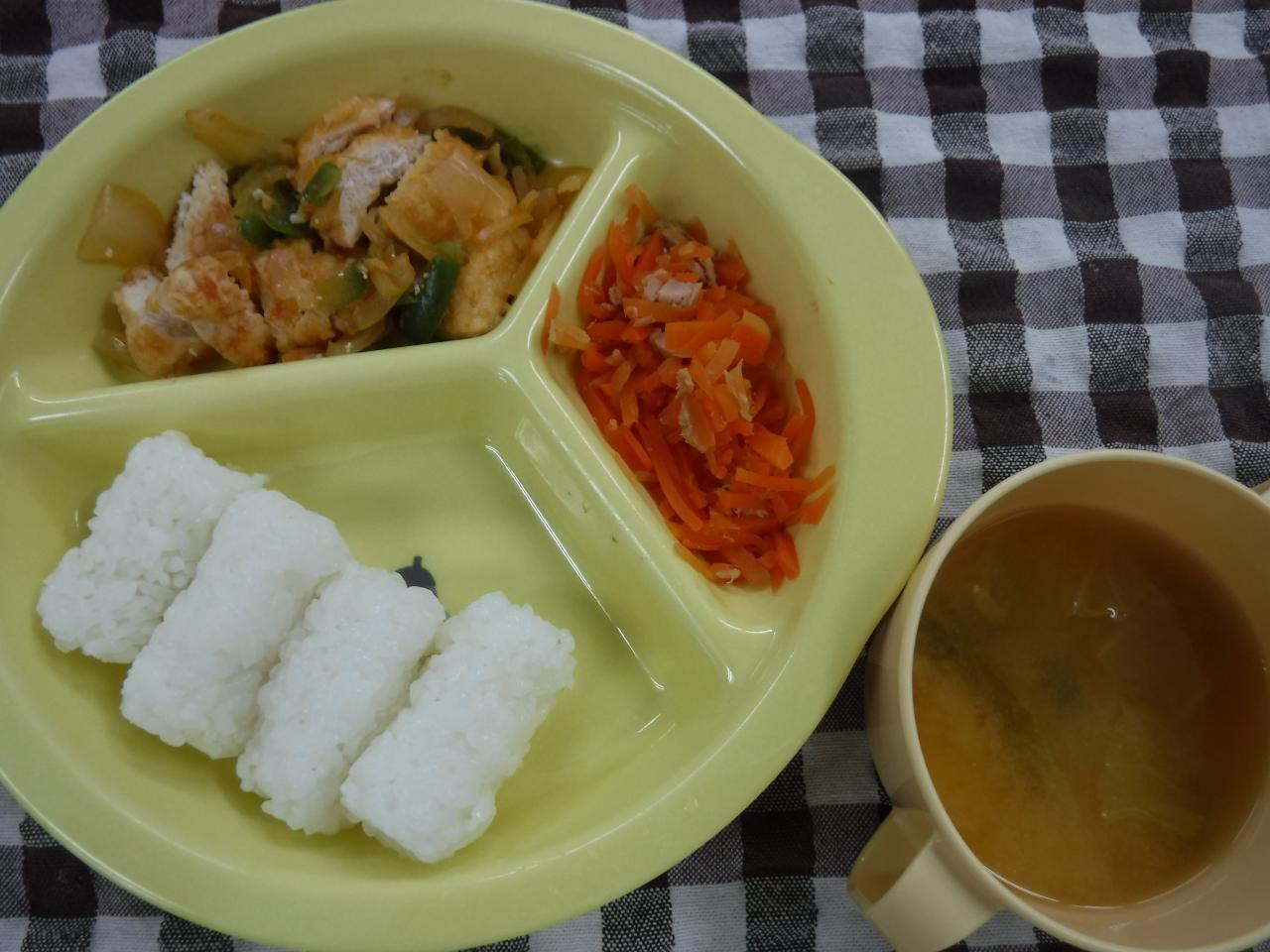 離乳完了食:俵おにぎり 鶏肉のオーロラソース 人参しりしり にらの味噌汁