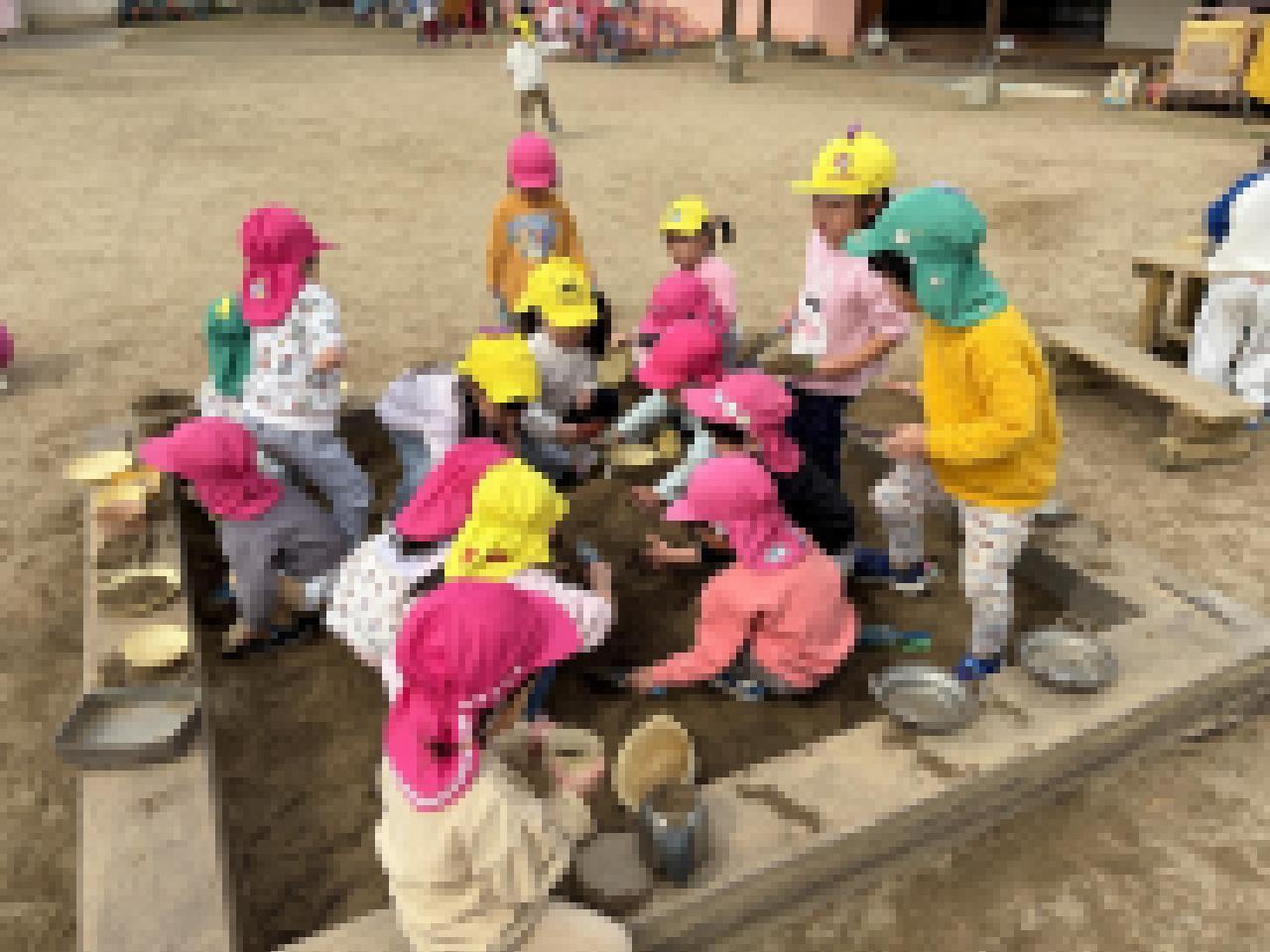 リズム、清潔検査、すいか組〜裏庭にて体力作り。めろん、ぶどう組〜みかん組との交流活動。