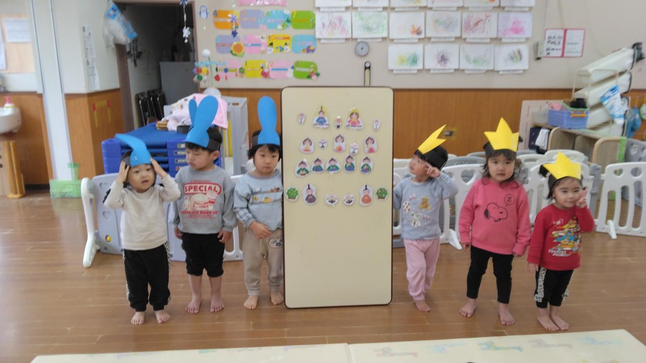 今日はひな祭りですね。 ♪うれしいひなまつり♬ の歌に合わせながら、ペープサートを楽しみました。 「おうちにも、お雛様ある~」と、嬉しそうに教えてくれました。
