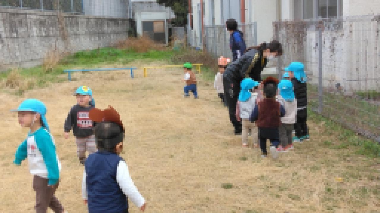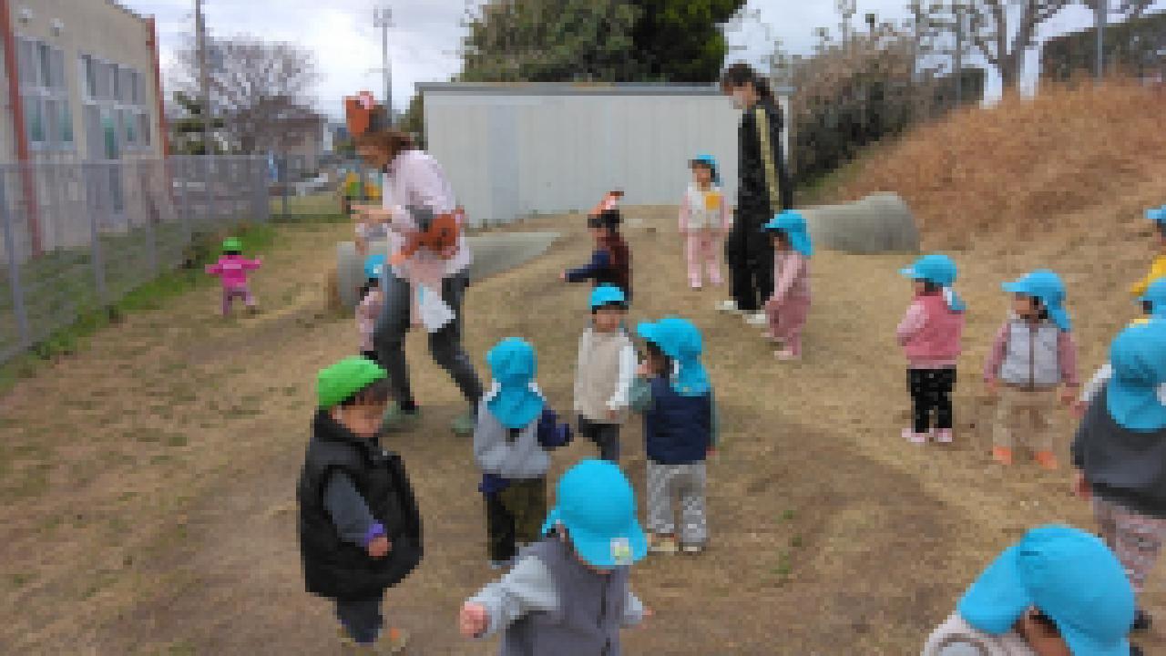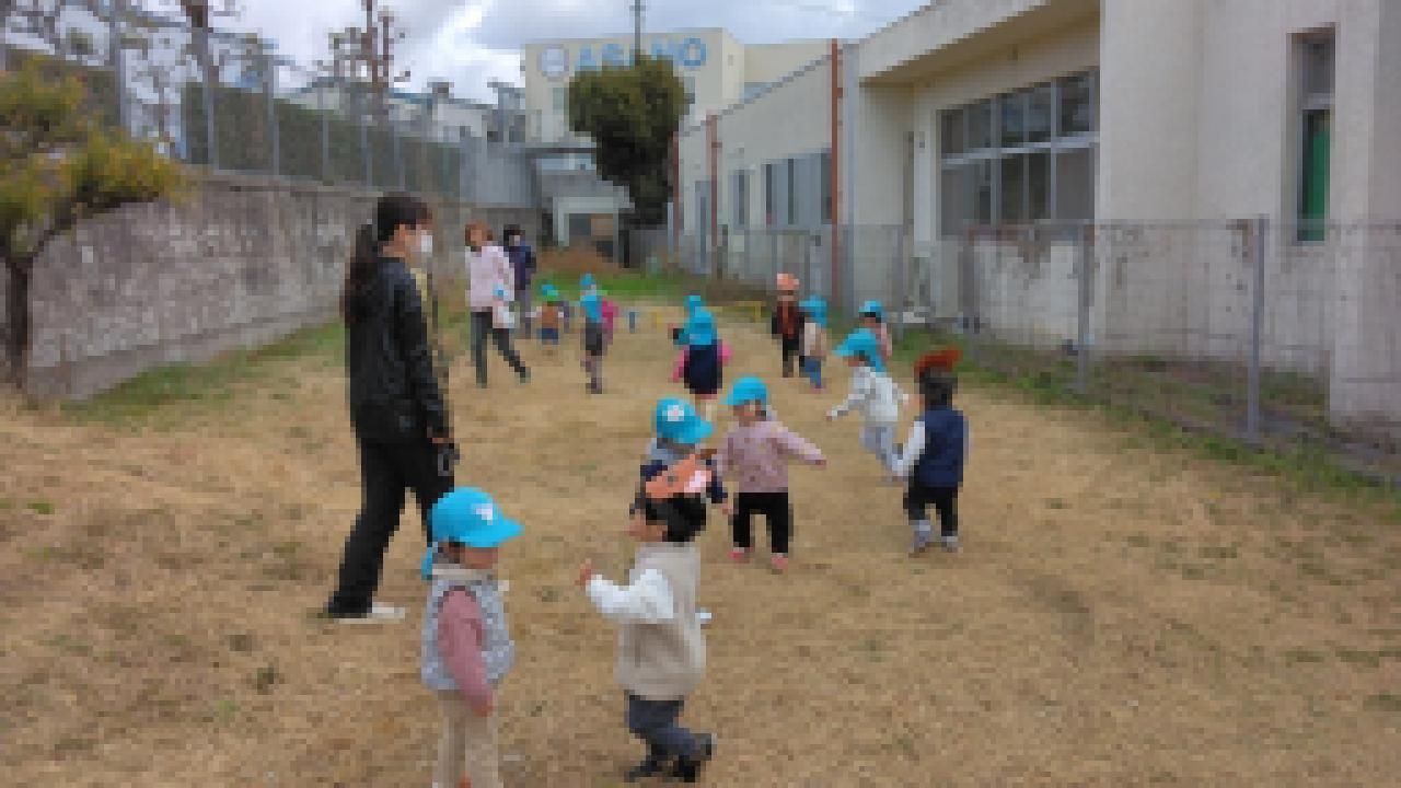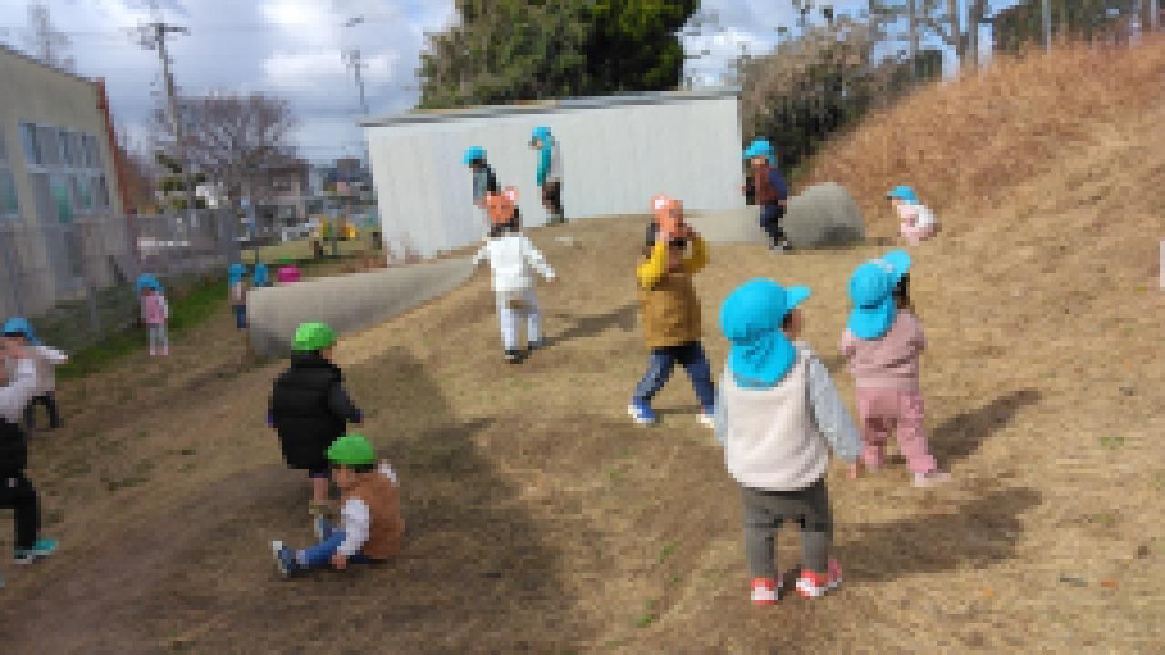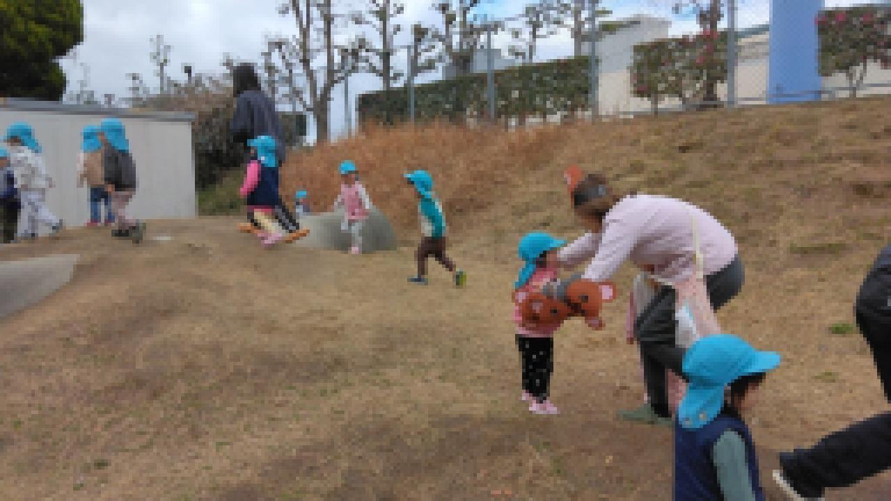 お外で❝むっくりくまさん❞をしました。子ども達は歌とルールをしっかり覚えているので、「くまさ~ん」と呼びかけるときには、すでに逃げる体勢になっている子が多くとても可愛いです。