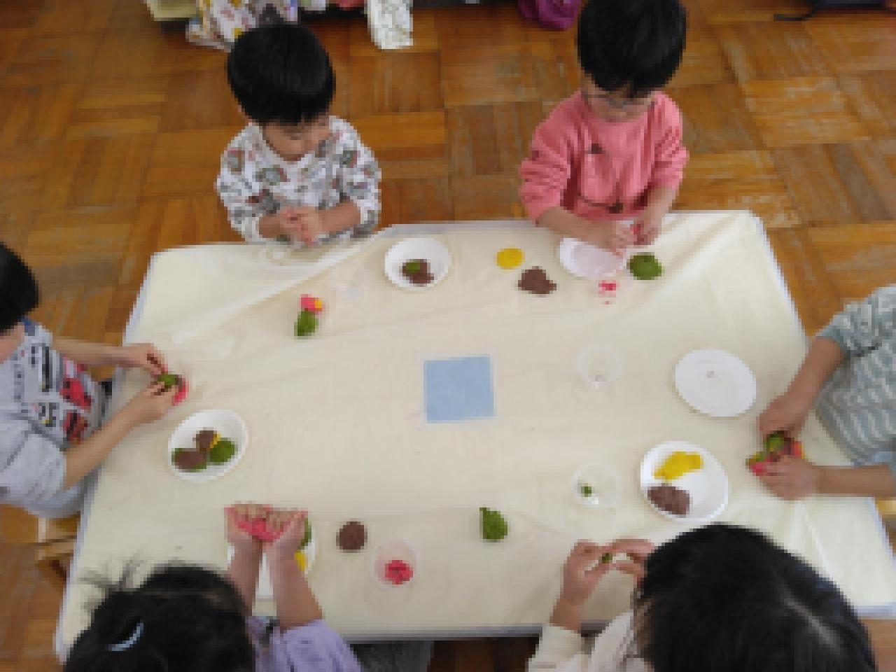 赤、黄、茶色、緑、白とたくさんの色の小麦粉粘土をつかって、美味しそうなデザートやパンなどのお菓子作りに夢中なみんなでした。
