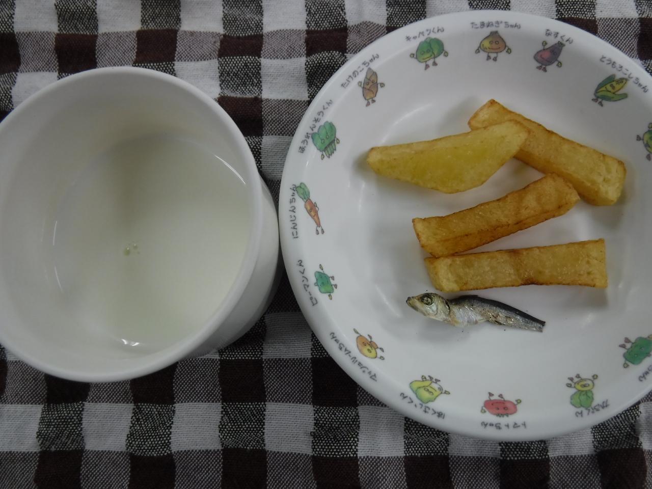 普通おやつ2歳児量:フライドポテト 牛乳 咀嚼:炒り煮干し