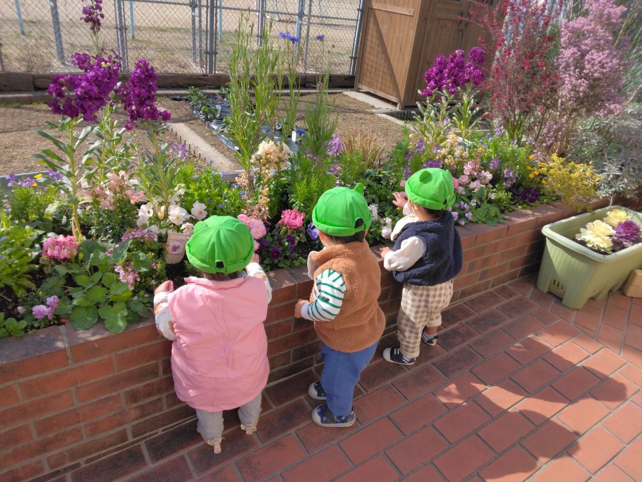 春の日差しで暖かい中、園庭遊び。園庭で追いかけっこをすると、キャーキャー言いながら、逃げるのを楽しんでいましたよ。きれいな花壇を見てニッコリ!でした。