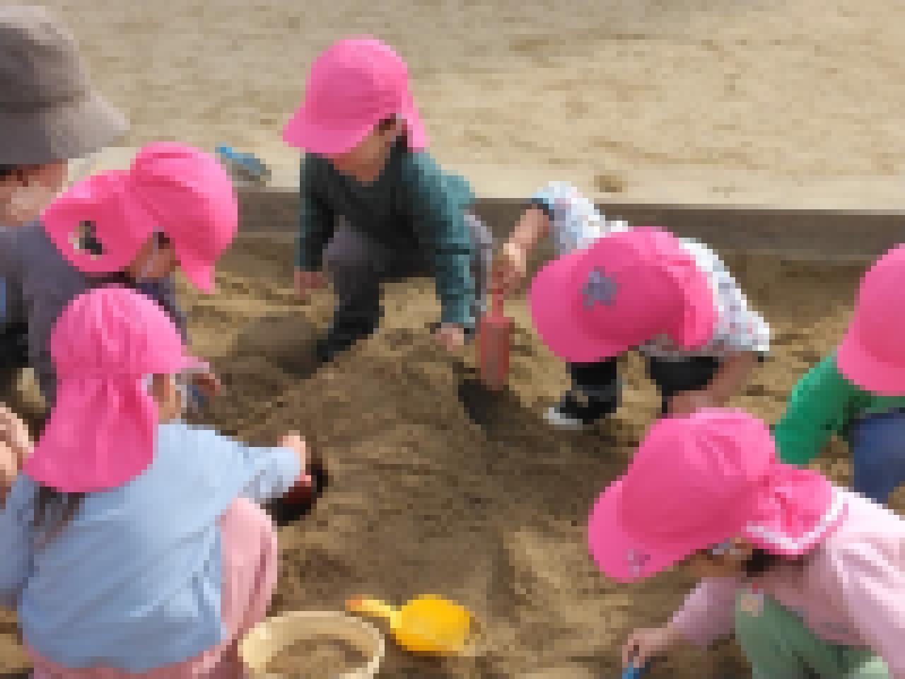 今日は何をして過ごすのか、今日することのお話を聞いて、園庭遊びでは、かけっこや、砂遊び、地面に絵を描き始めたお友達と一緒に描いて楽しんで遊びました。