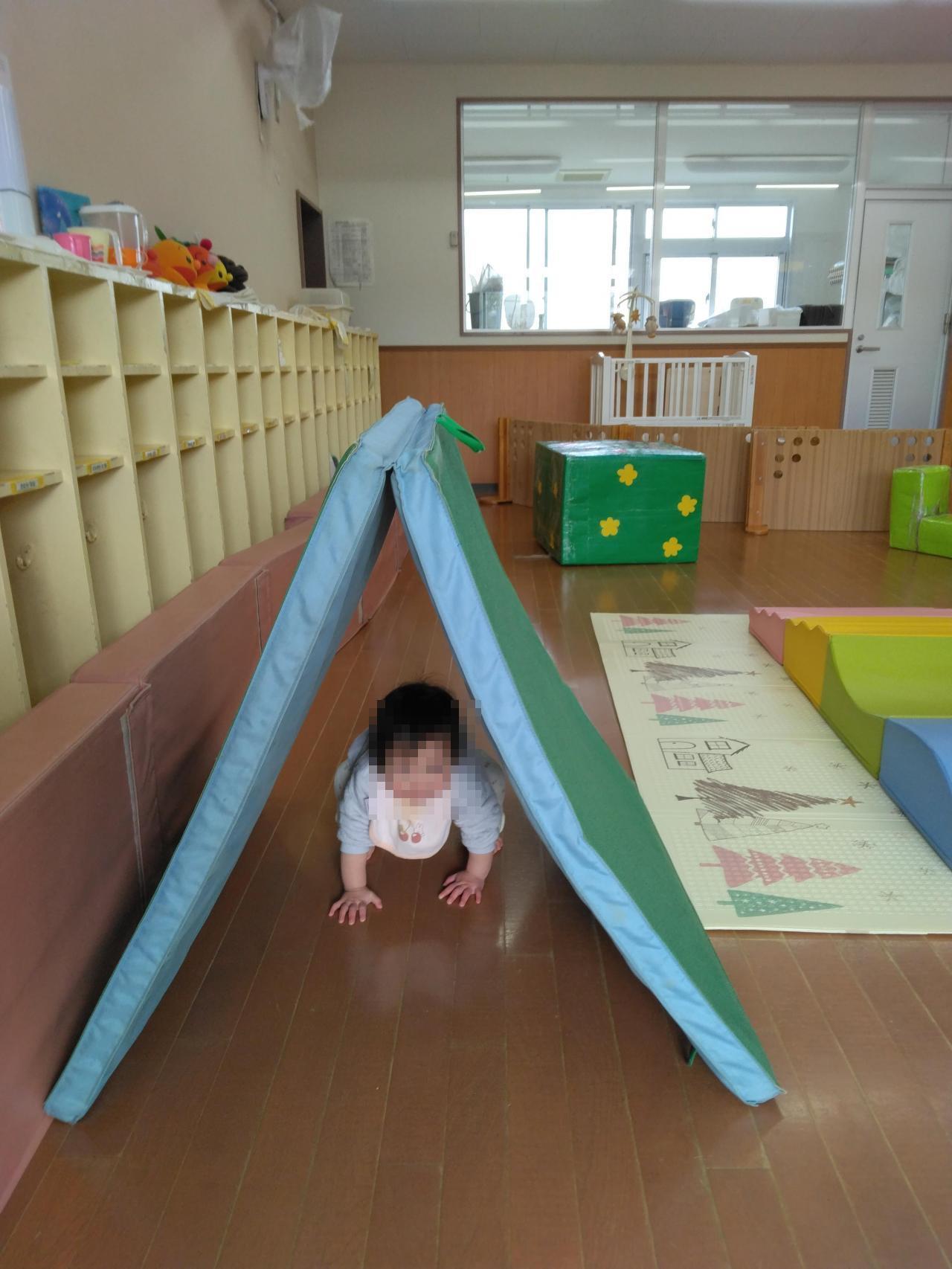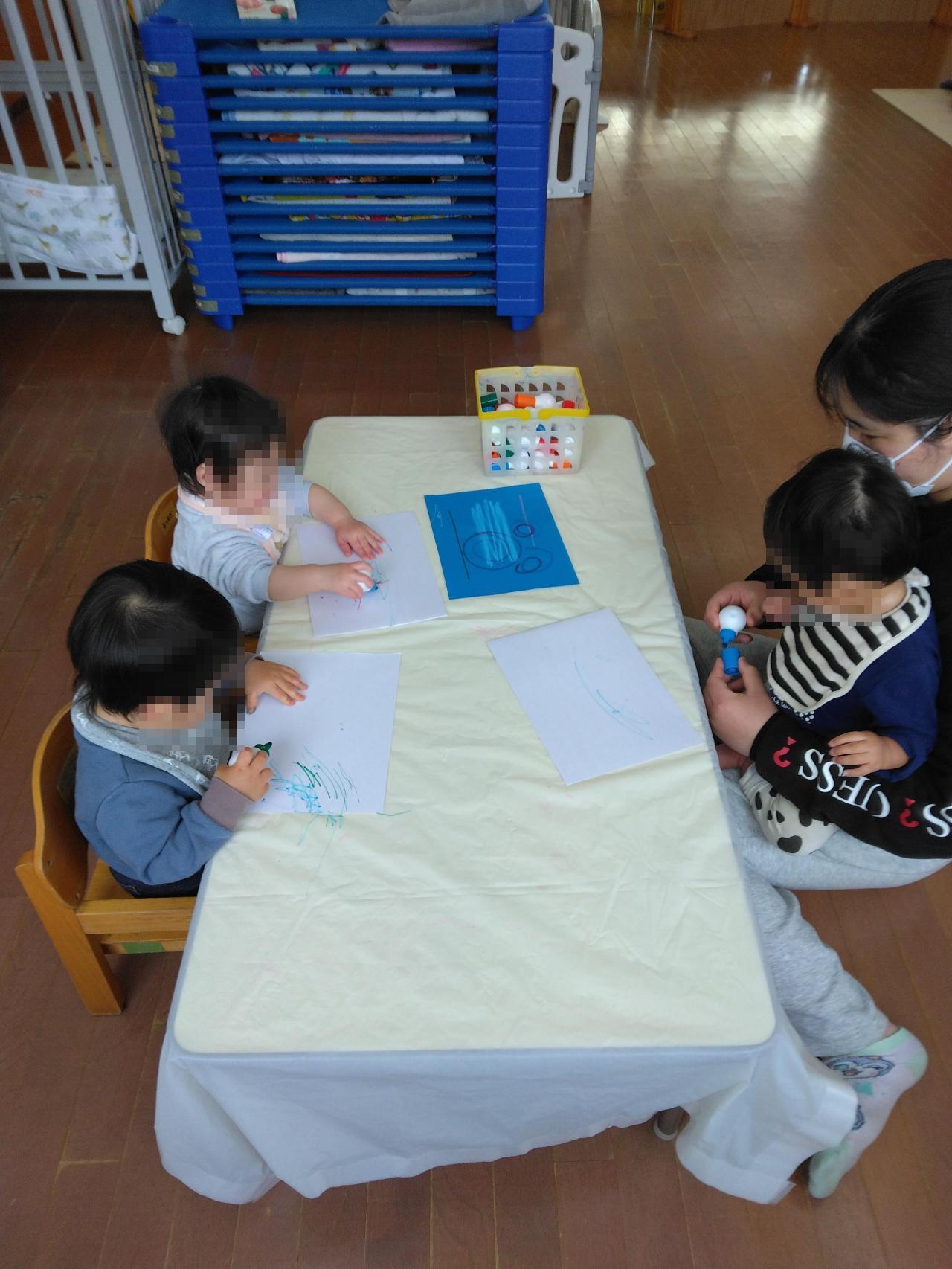 今日は、お絵描きをしました。クレパスやプチマジーのペン(乳児用マジックペン)を使って、腕を左右に動かし、ダイナミックに描きましたよ。さくらの部屋では坂道を登ったり、トンネルに入って、いないいないばぁーをしたりと、しっかり体を動かしました。テラス散歩後、幼児クラスに行き、布のブロックが気に入って遊んでいました。また園内探検を楽しみたいです。