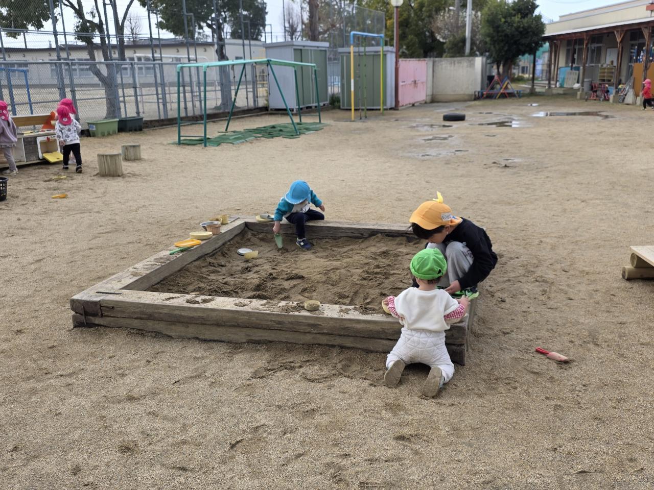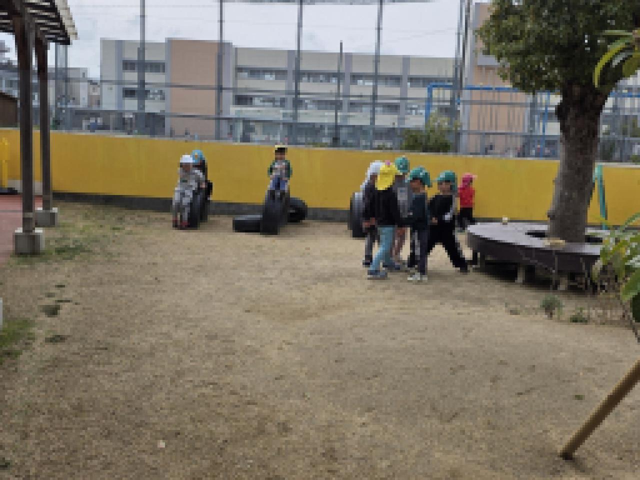 3歳4歳(園庭遊び、みかん組との交流遊び)、5歳(裏庭遊び)