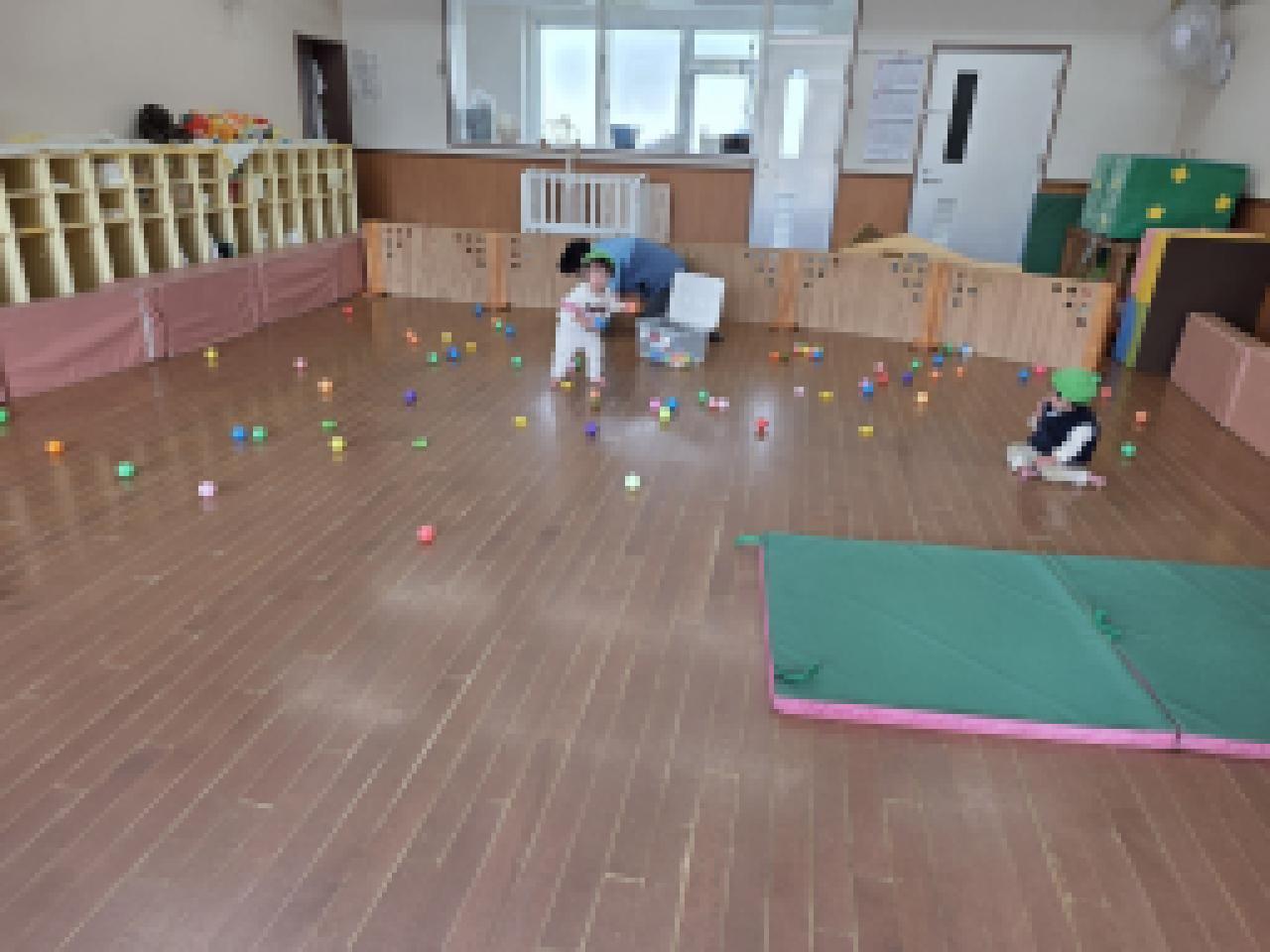 さくらんぼ組;赤ちゃん体操、ふれあい遊び、室内あそび(新聞遊び、リズム、運動あそび)