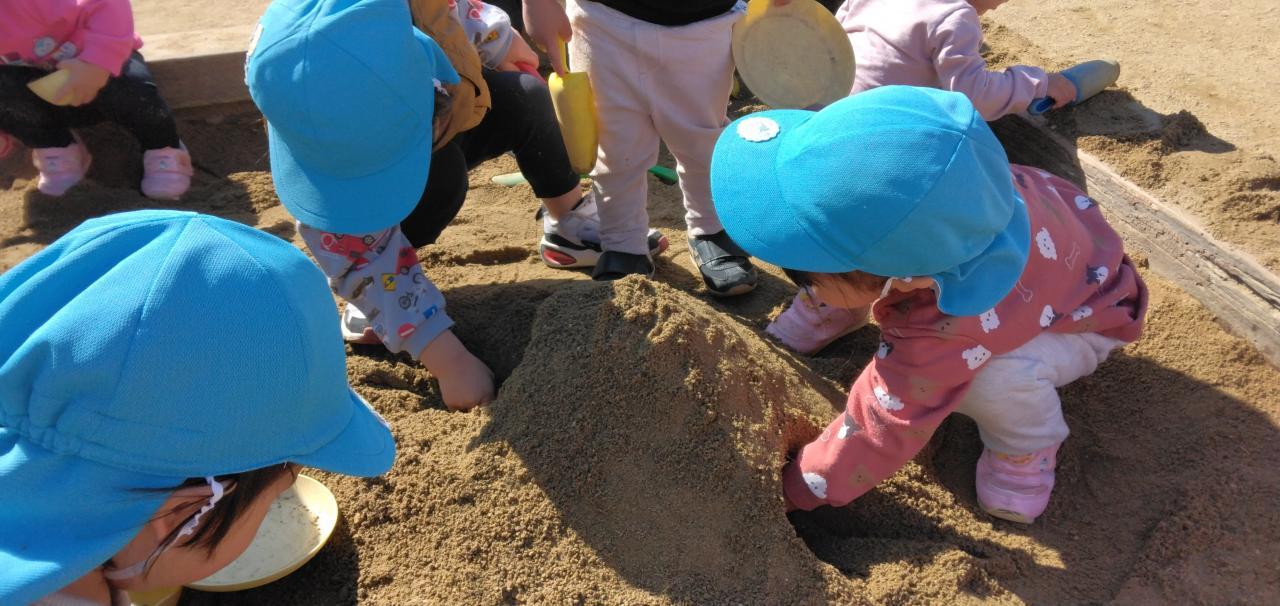砂場で、みんなで一緒にトンネルを完成させました!