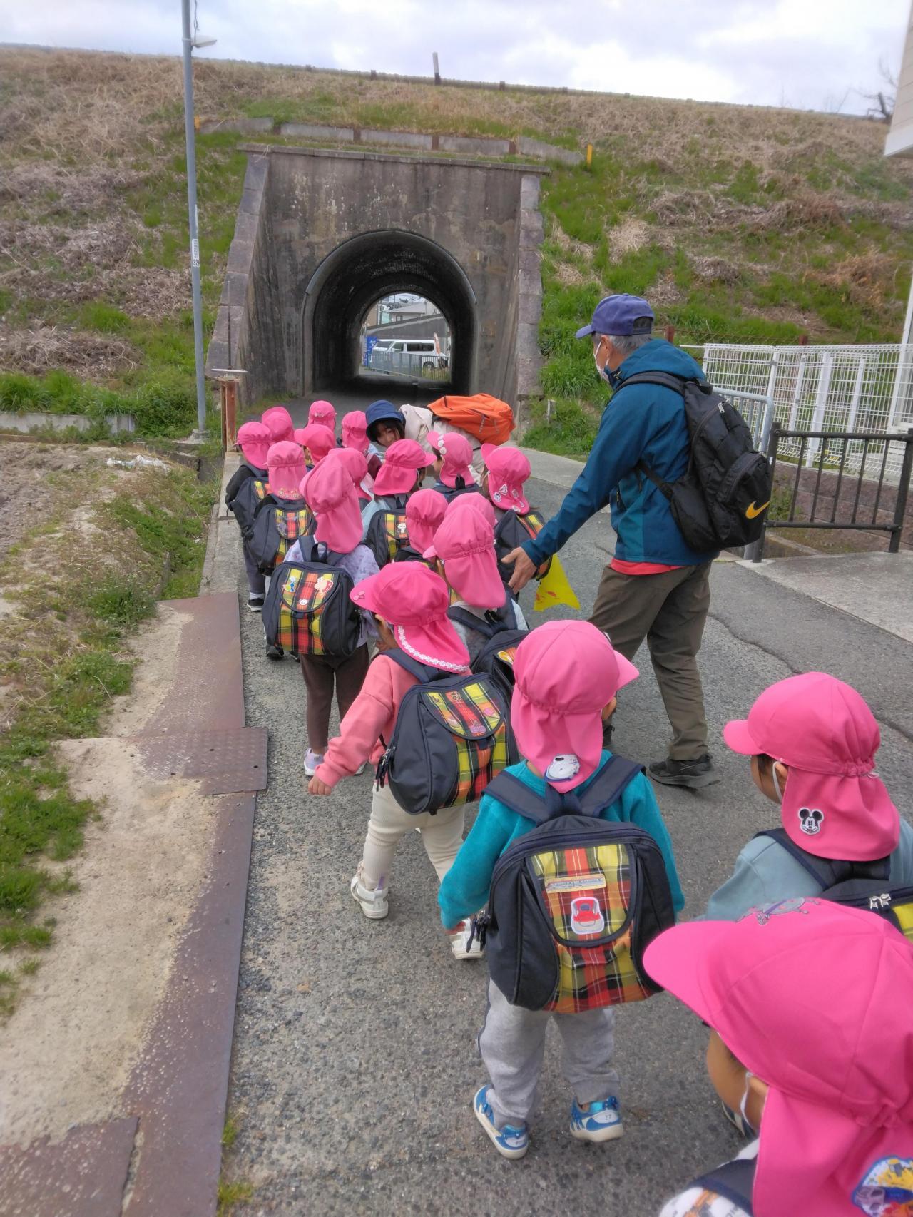 トンネルの中で、ちょうど電車が通り、電車の音にみんな大興奮でした。