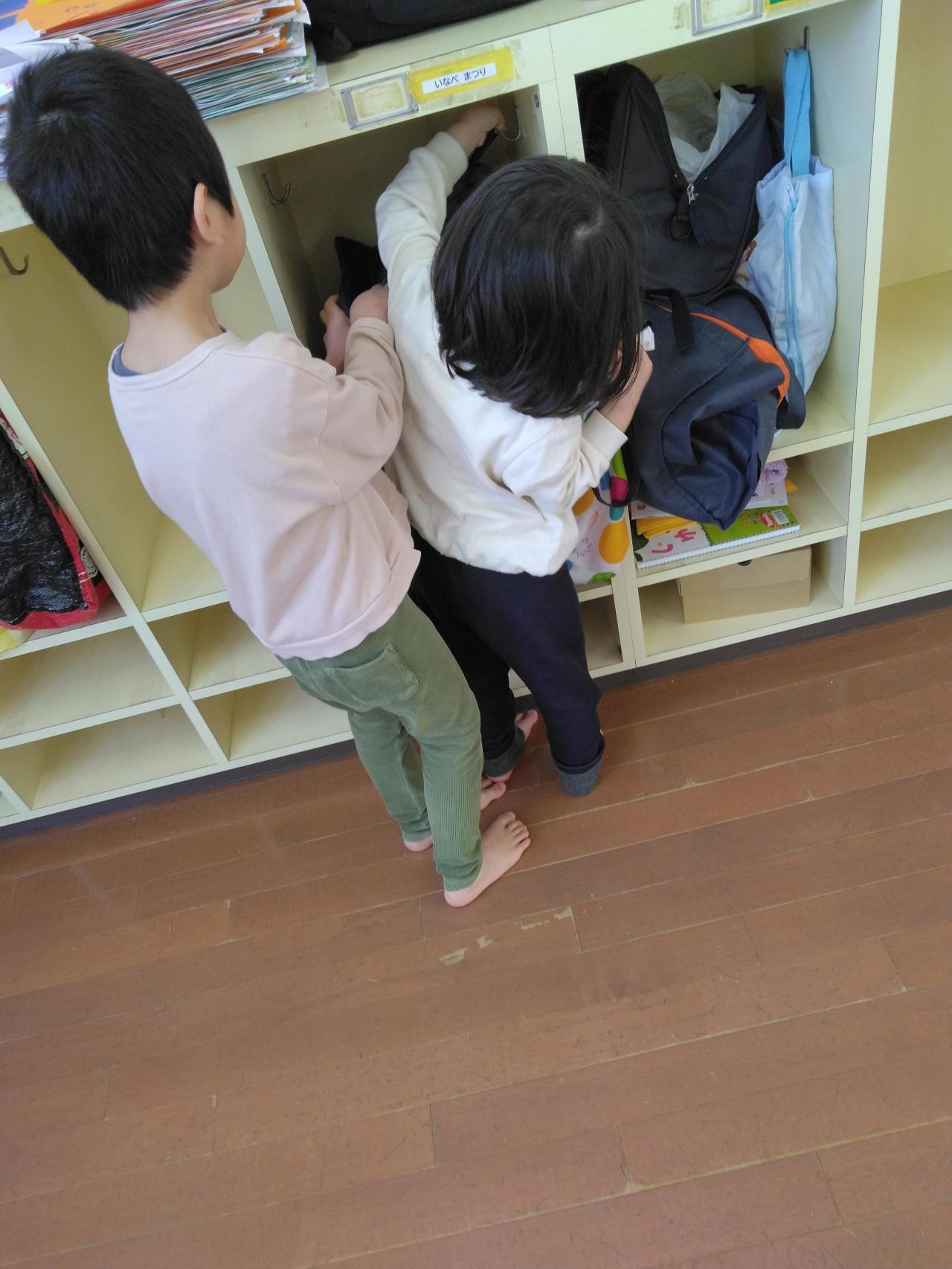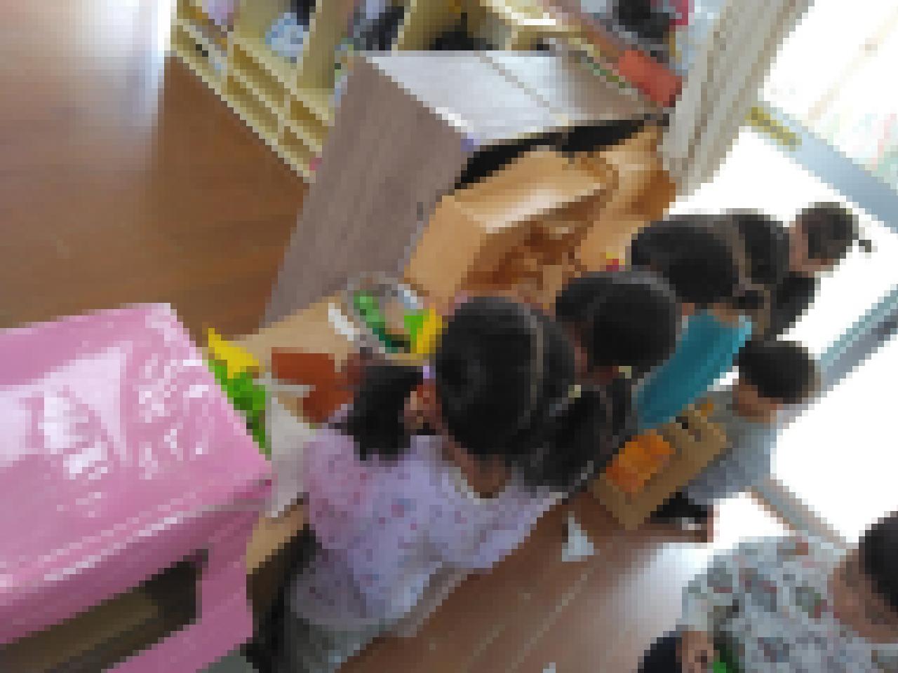 新ぶどう組は、ままごとコーナーが人気です。幼児クラスの玩具が「これ、おもしろそう」と目が輝いています。手に取って、仲間と声を掛け合って楽しんでいます。