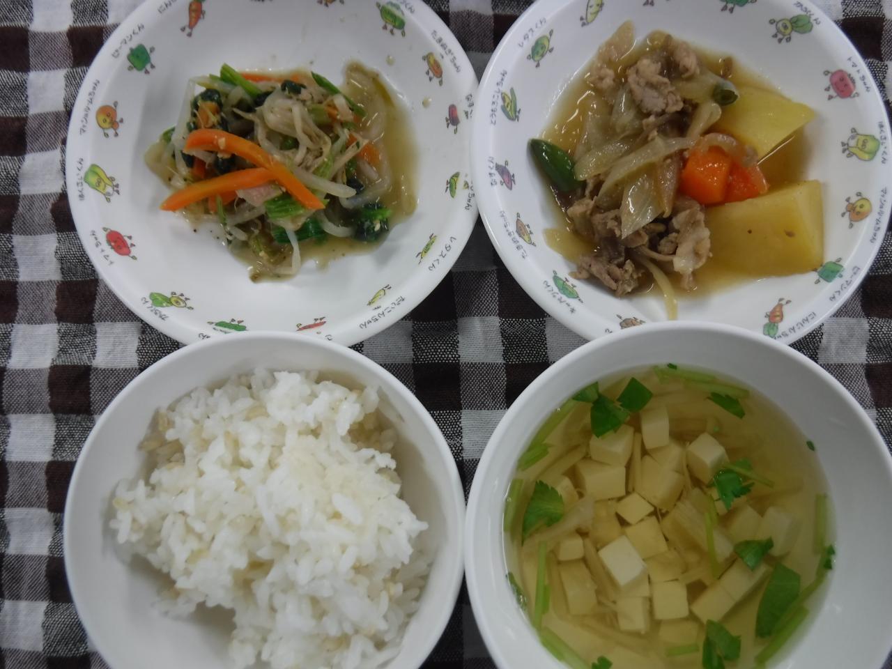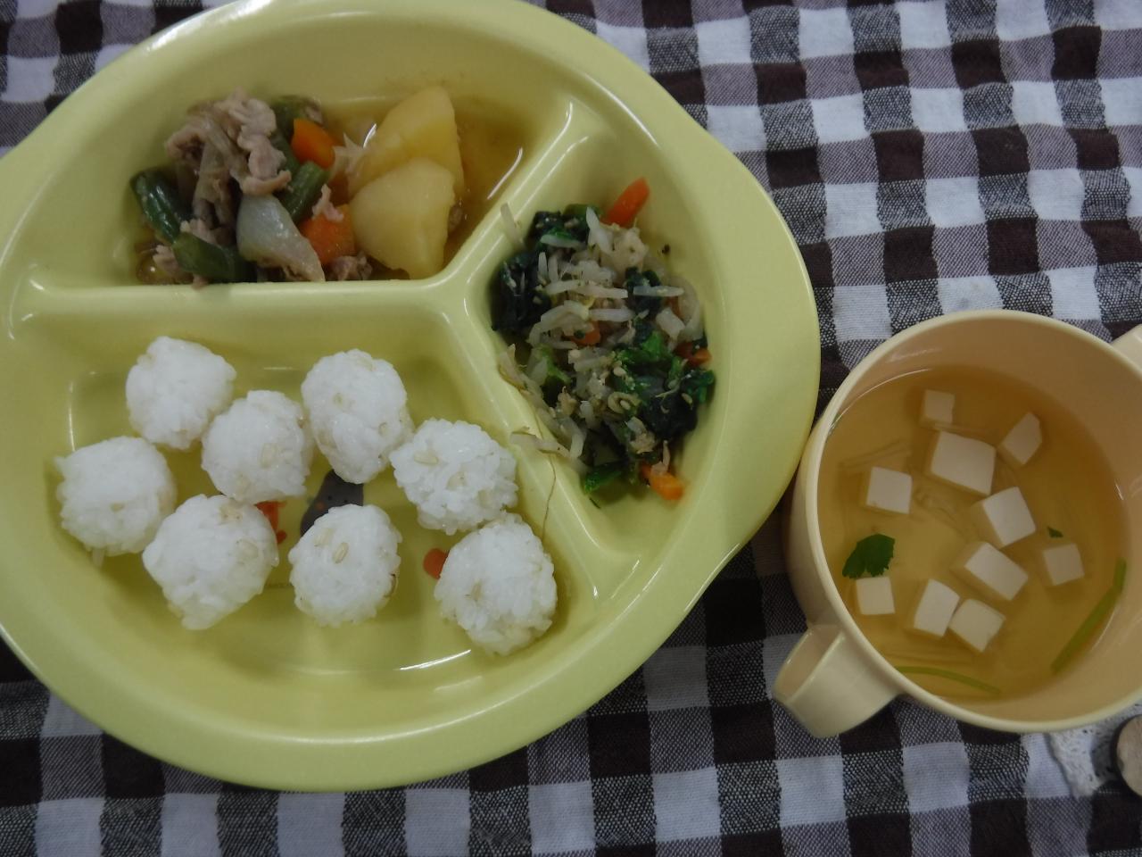 普通給食2歳児量:発芽玄米入りごはん 肉じゃが ほうれん草ともやしの胡麻和え 豆腐のすまし汁