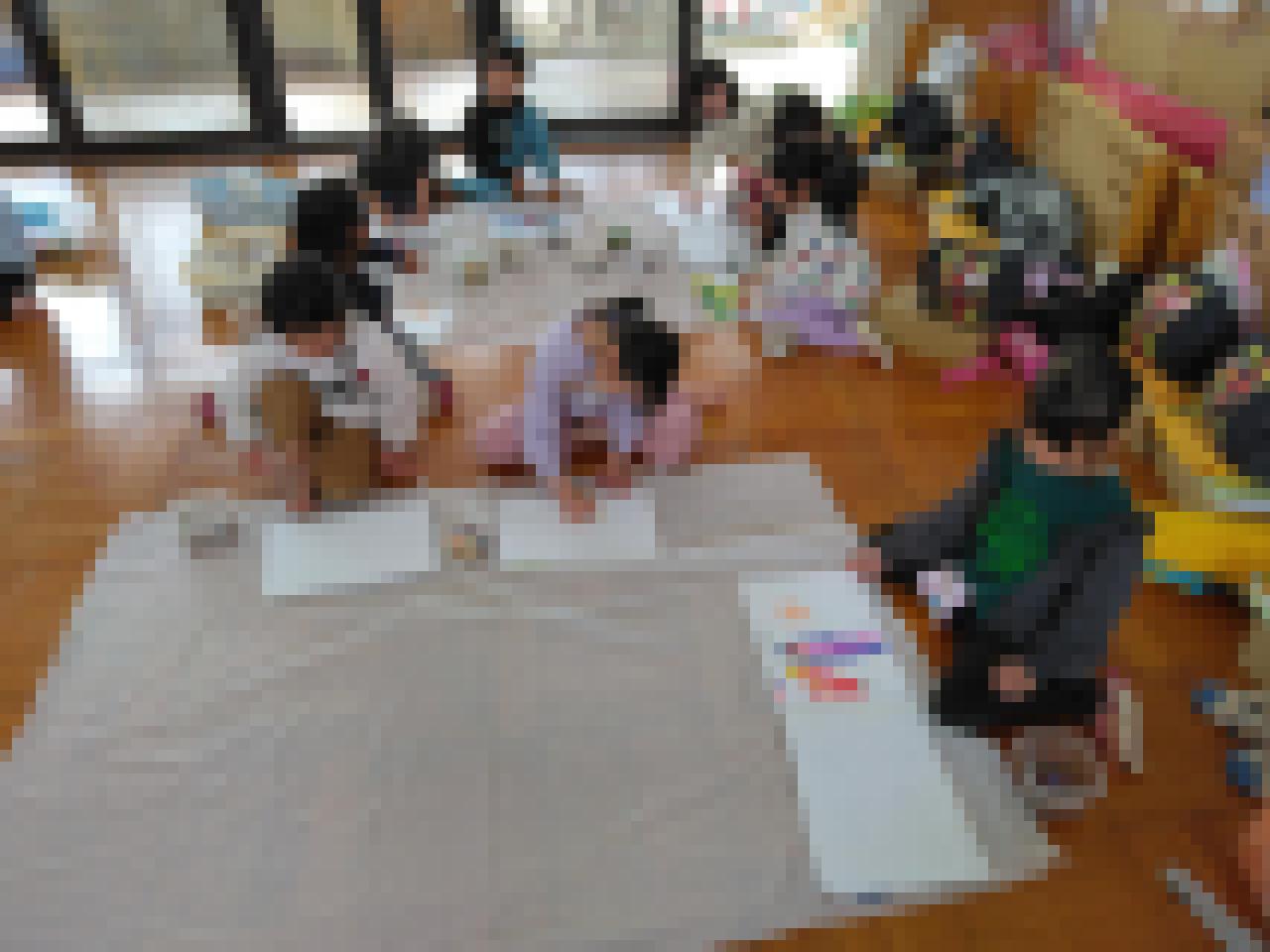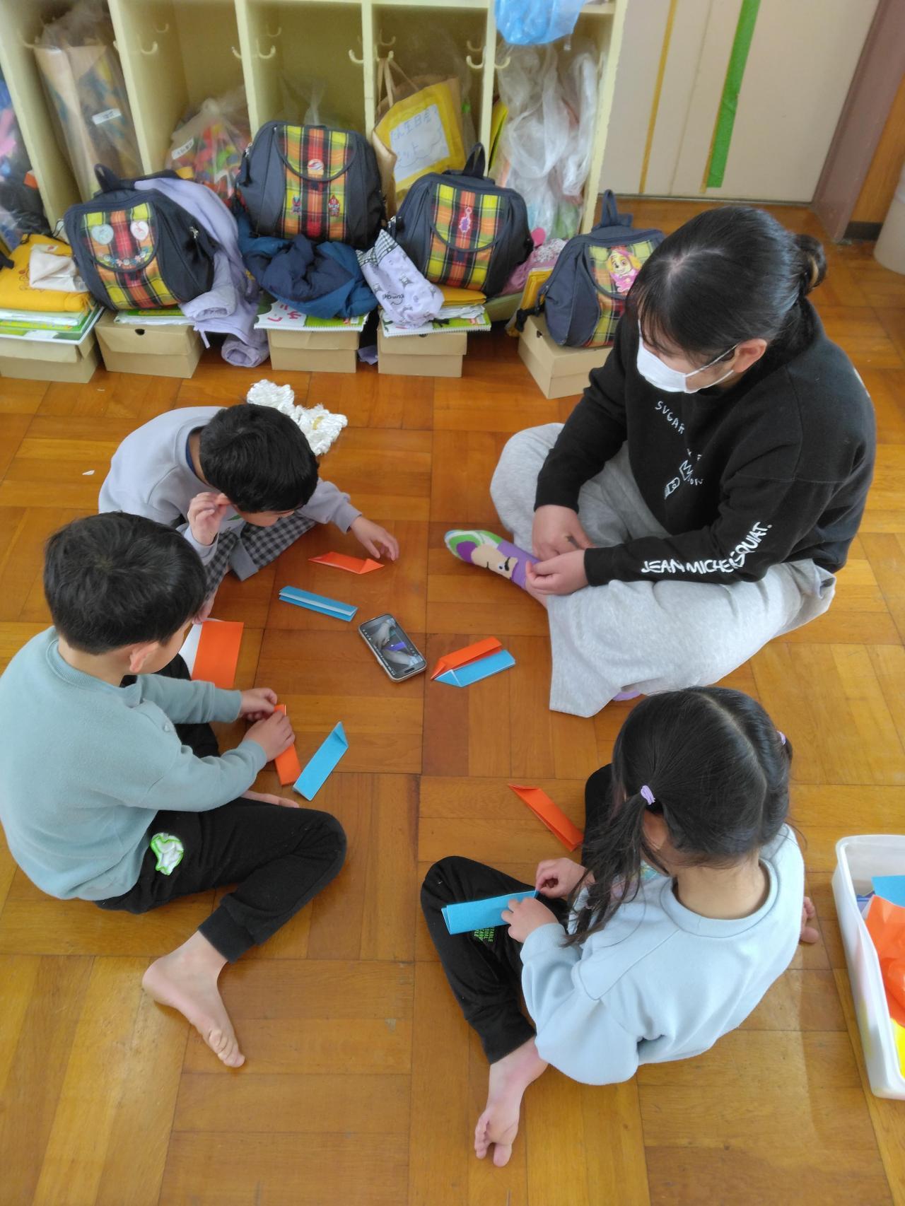 まず、はじめに室内で、手作りの草履づくりやおえかき、折り紙で遊びました。
